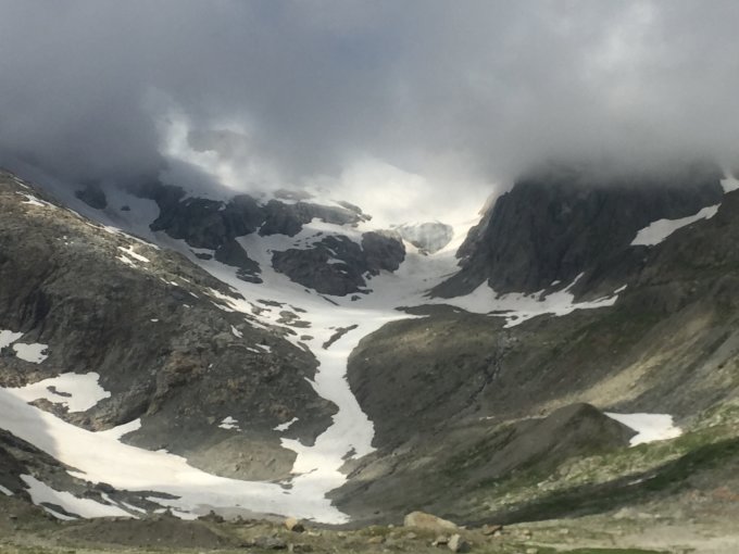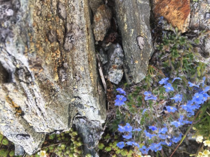 Man muss nicht verrückt sein, um jetzt noch auf Skitour zu gehen, aber es hilft :-)! Nein, es war halt nur so, dass meine innere Befindlichkeit nach einem Schlusspunkt für die schöne und lange Skitourensaison 17/18 verlangte... Da das Muttenhorn mit seiner Nordexposition beim herrschenden Büsserschnee nicht so verheissungsvoll wirkte, griff ich auf die andere eiserne Reserve zurück, die ich (ausserhalb der Sommerskigebiete) kenne: Die Steilimi. Und wirklich kann man da noch prima rauf, auch wenn ich heute der Einzige im Gebiet war. Zuerst ein bisschen der Strasse nach tragen bis Umpol, denn rauffahren kann man nicht ganz. Dann noch etwas durch die Schwemmebene tragen und schon kann man anfellen. Es liegt bis zum Steilstück des Gletschers noch sehr reichlich Lawinenschnee, drum geht das. Das Steilstück ist links blank, rechts liegt ebenfalls noch Lawinenschnee. Wirklich gute Tourengänger könnten das wohl fellen, für weniger gute (wie mich) gibt es Steigeisen. Danach büsserte ich mich noch über Löcher und Rinnen bis zur Limi hinauf. Und meine Erwartungen wurden nicht enttäuscht: Dort oben, umgeben von Fels und Eis, blüht ein wahrer Alpengarten. Entsprechend genoss ich die Rast ausgiebig. Die Abfahrt hätte schlechter sein können: Zuerst ein paar OK-Schwünge in der steilen Flanke des Vorderen Tierbergs, dann Gerumpel über die Rinnen bis zum Steilhang, und von da an ordentlicher Sommerschnee mit fahrbaren Dellen bis ganz runter.