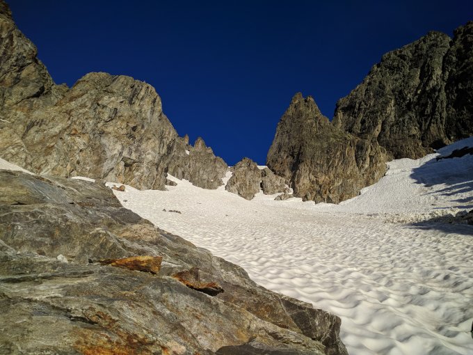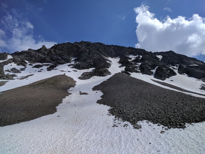 Die Südturmlücke apert jedes Jahr etwas früher aus und wird dann auf Grund des Schutts steinschlaggefährdet. Aber im Moment sind die Verhältnisse noch tiptop. Abstieg über den Glattfirn und die Kröntenhütte kein Problem.