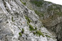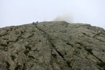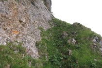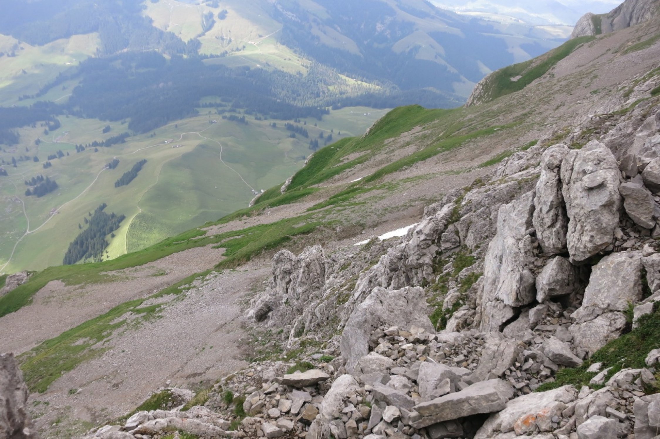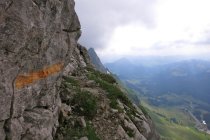 Weg gut markiert mit blassen aber gut sichtbaren orangen Farbklecksern, im Gras unübersehbare Tritte. Wer die ersten ziemlich "gfürchigen" Meter nach dem Kamm überstanden hat, kann ruhig weitergehen, denn die einzige andere ausgesetzte Stelle ist jetzt mit einer Kette entschärft.
