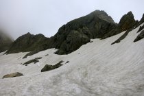 Leider war das Wetter auch am Nachmittag verhangen, wenn auch trocken, Nebel ab der Himmelsleiter. Die vielen grasigen Tritte aber weitgehend trocken; im Abstieg vom Hühnerbergsattel zur Blau Schnee-Spur ein nicht ganz unproblematisches, hartes Altschneefeld (Steigeisen)