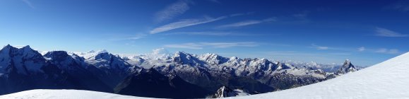 Sehr schöner Hüttenaufstieg mit fantastischer Aussicht auf ein Duzend 4000er. Für den Abstieg haben wir den wohl selten begangenen Weg via Schatzplatte gewählt, wohl und gerade wegen den Verwüstungen aufgrund der vielen Lawinen im vergangenen Winter, neu ein T4. Traumhaft einsam.
