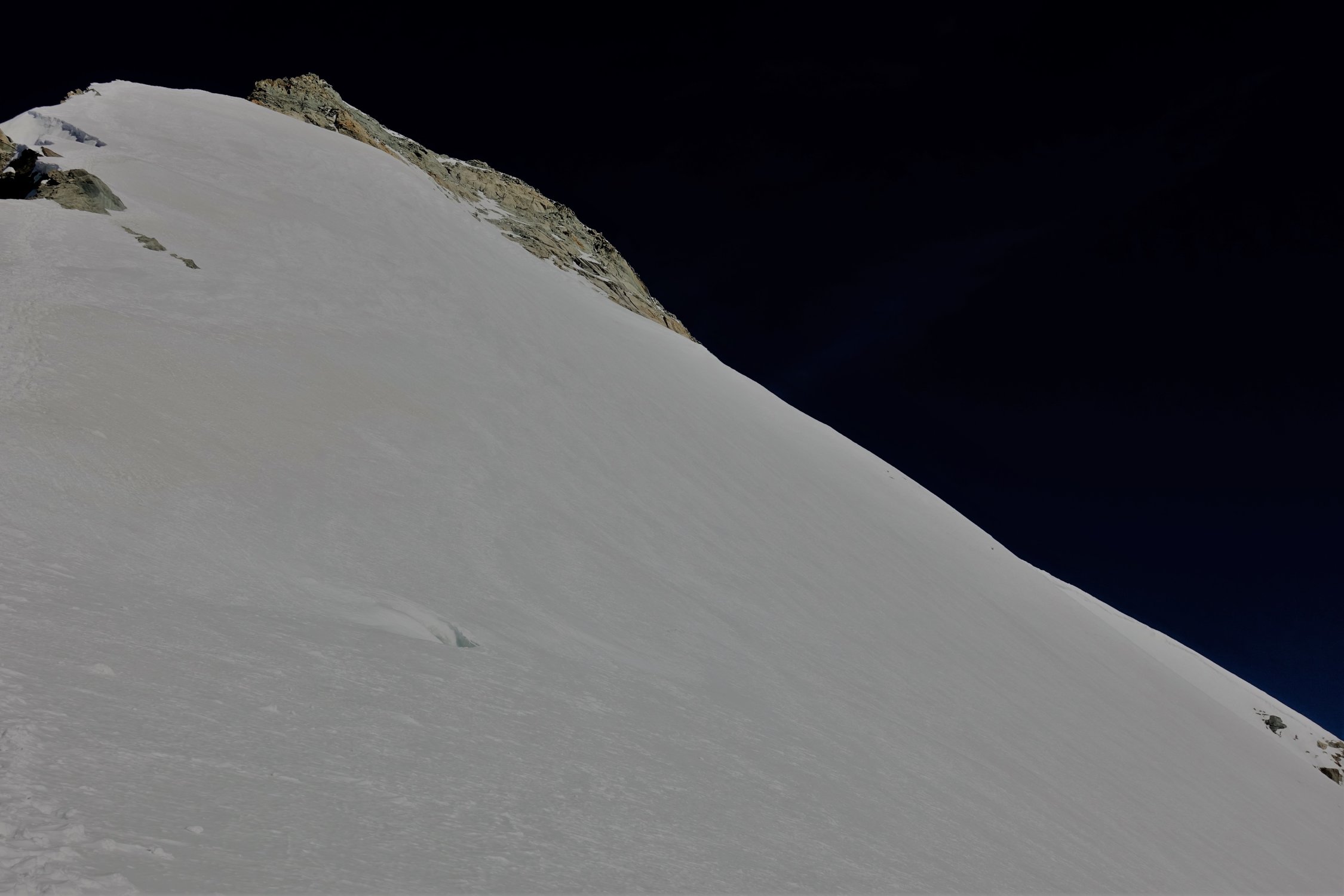 - Firn noch gut mit Trittschnee bedeckt, nur vereinzelt greifen die Steigeisen in das Eis darunter, zuoberst bis ca 45 Grad steil