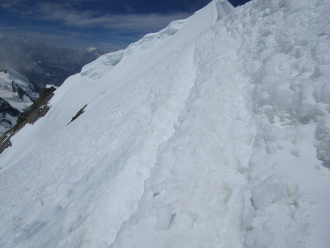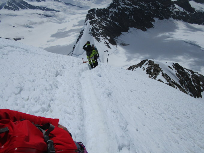 Um 9.00 noch Graupelschauer und "dicker" Nebel beim Jungfraujoch, beim Gipfelankunft 11.30 h, beste Sicht und viel weniger Wind. Der Gipfelgrat ist sehr gut Gespurt, ganz gute Verhältnisse. Recht viel Schnee am Berg!
