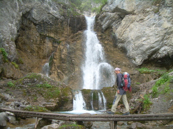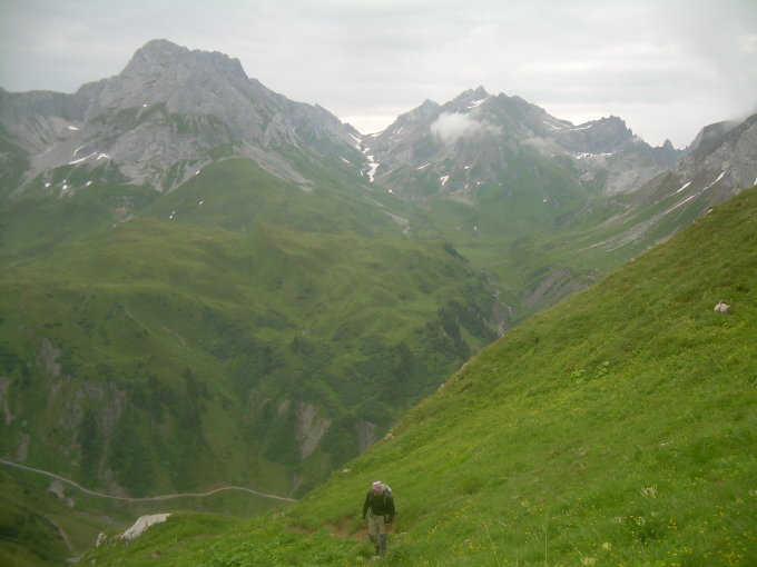 Samstag wurden wir an der Roggalspitze im parallel unterhalb der Nordkante verlaufenden "Schiffsbug" derart mit Steinen beschossen, dass wir es vorzogen, nach der ersten SL den Rückzug anzutreten. Verursacht wurde der Steinschlag höchstwahrscheinlich durch eine über die Nordkante abseilende Seilschaft. Da wir für die Einfahrt zum Mautsträsslein hinter Zug zum Spullersee frühmorgens die "deadline" nicht geschafft hatten, mussten wir von Zug aus über das Stierlochjoch zur Roggalspitze wandern. Landschaftlich war das zwar wunderschön, jedoch zeitraubend. Nach oben bereits erwähntem Ungemach war die Zeit für den Gipfel dann definitiv abgelaufen, weshalb wir uns mit der Durchsteigung des Westwand-Vorbaus begnügten.