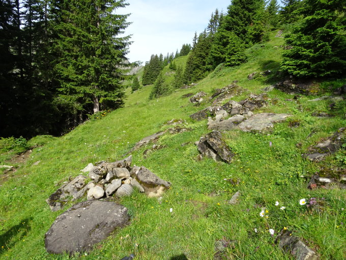 M1 (616'310 / 165'225; ca. 1860m; Rohling, kein Loch) befindet sich am Pfad, der von der Alp Oberniese herkommt. Um M2 bis M4 zu finden, muss man noch etwas weiter dem Pfad entlang und den markanten oben "abgeschnittenen" Felsblock finden, wie es beschrieben ist. M2 (616'379 / 165'373; ca. 1920m; 3-4m leicht unterhalb vom Block), M3 (616'385 / 165'390; ca. 1935m; wenig oberhalb des Blocks) und M4 (616'377 / 165'412; ca. 1945m; schwer erkennbar, Rohling mit Schleiflinien, überwachsen; ca. 20m oberhalb von M3). Wir sind danach entgegen des Routenbeschriebs im Hikr-Eintrag durch die Baumlücke gegen Westen in einen Känel rübergequert und diesen hochgestiegen. Man muss den markanten weisslichen Block anvisieren. Ca. 10m gerade oberhalb befindet sich M6 (616'325 / 165'508; ca. 1995m; halber Stein). Auf gleicher Höhe bleibend quert man nun über das überwachsenen Blockfeld gerade nach Osten. Hinter der Wölbung kommt man auf eine blockübersäte Fläche. Direkt hinter dem Steinmännchen erkennt man M5 (616'385 / 165'497; ca. 1995m). Nach der Beschreibung sollte man nun zwei weisse pyramidenartige Blöcke. Nur sind inzwischen die Fichten gewachsen. Man steigt etwas an, bis man linkerhand eine ca. 80cm hohen aufgestellten weisslichen Stein sieht. Ca. 20m westlich davon hinter einer Reihe von Fichten findet man M7, den schönsten Stein (616'363 / 165'534; ca. 2020m; gespalten, heller als andere). Dann kann man einfach aufsteigen, bis man einen horizontalen Weg kreuzt. Nordöstlich davon befindet sich hinter einer leichten Anhöhe eine kleine Mulde. Ganz am nordöstlichen Ende liegt M8 (616'364 / 165'640; ca. 2070m; eingeklemmt zwischen zwei Blöcken). Dann kann man zum Pfad zurück und gegen Westen und weglos zur Alp Niesechumi und weiter auf den Grat steigen. Derzeit herrliche Blumen und mindestens 4 Orchideenarten. Wenn man Glück hat, sieht man Murmeltiere oder Alpensalamander! Im Niesendörfli befindet sich M10. M10 wurde dort abgelegt - neben einer Tafel, die auf die Steine verweist. Lohnende Halbtageswanderung bei gewittrigen Halbtagen!