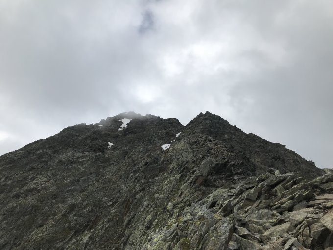 Wir starteten von der Hütte aus um 07:20 Uhr. Der Fels war nass und brüchig wie vermutet. Vor dem Einstieg in den Grat gab es zwei kleine Schneefelder. Die Wegfindung war nicht schwer aber nicht so einfach wie überall beschrieben. Vielleicht lag das auch am Gewitter letzte Nacht. Vor dem Wächter/Gendarmen wo die zwei Gräte zusammenkommen, fiel ein grösserer Brocken ab auf die Schulter meiner Partnerin. Danach kehrten wir um. Meine zwei anderen Kollegen erreichten den Gipfel noch...