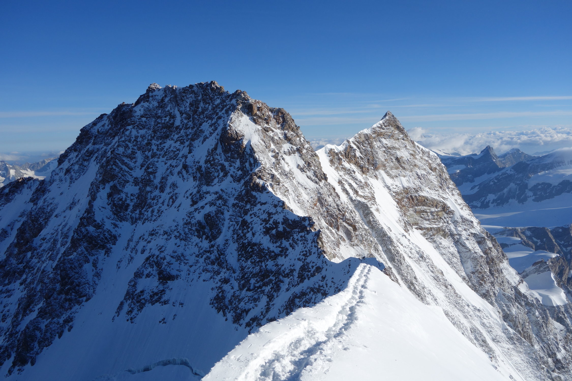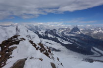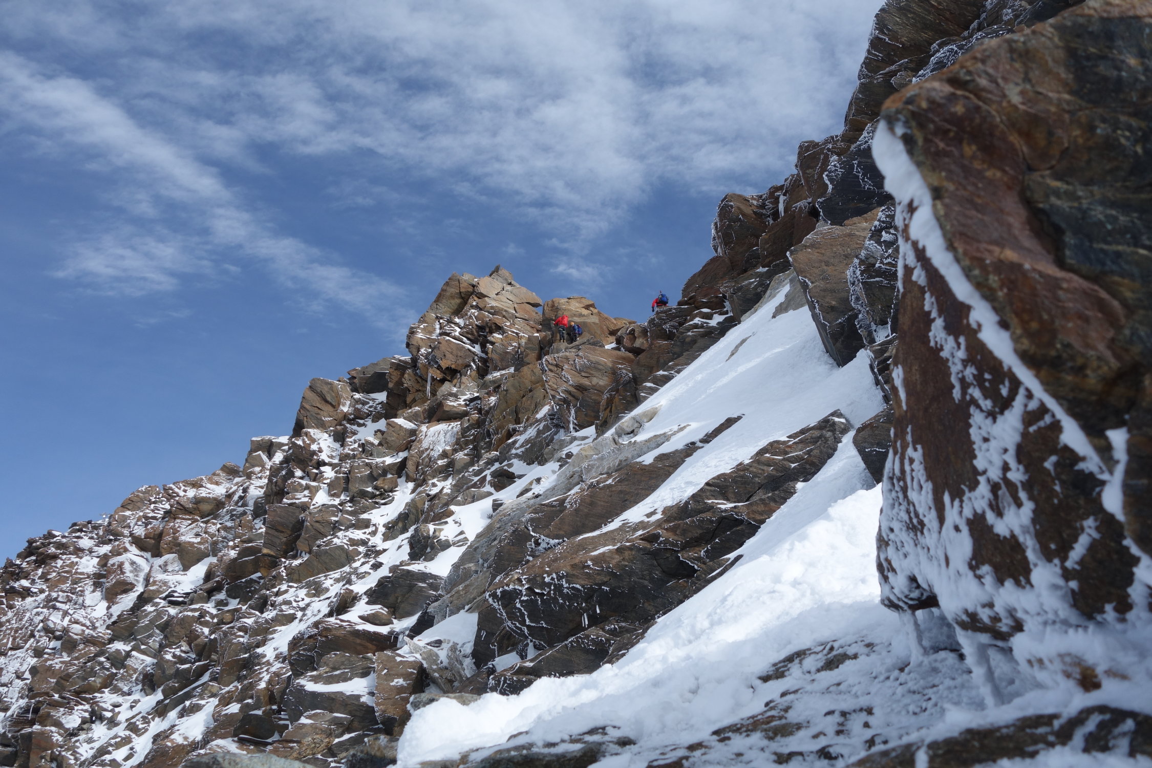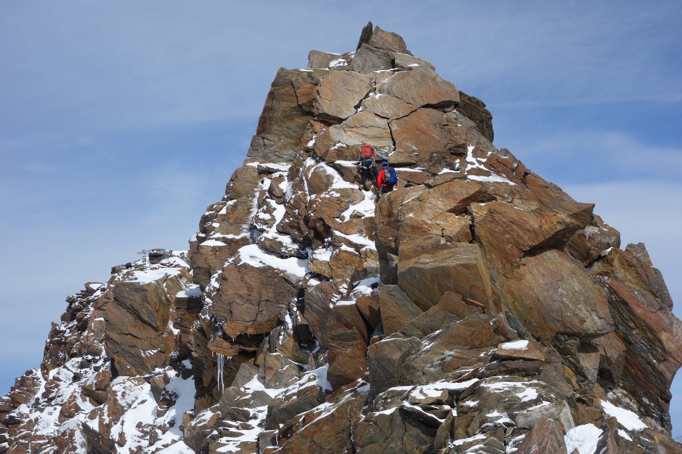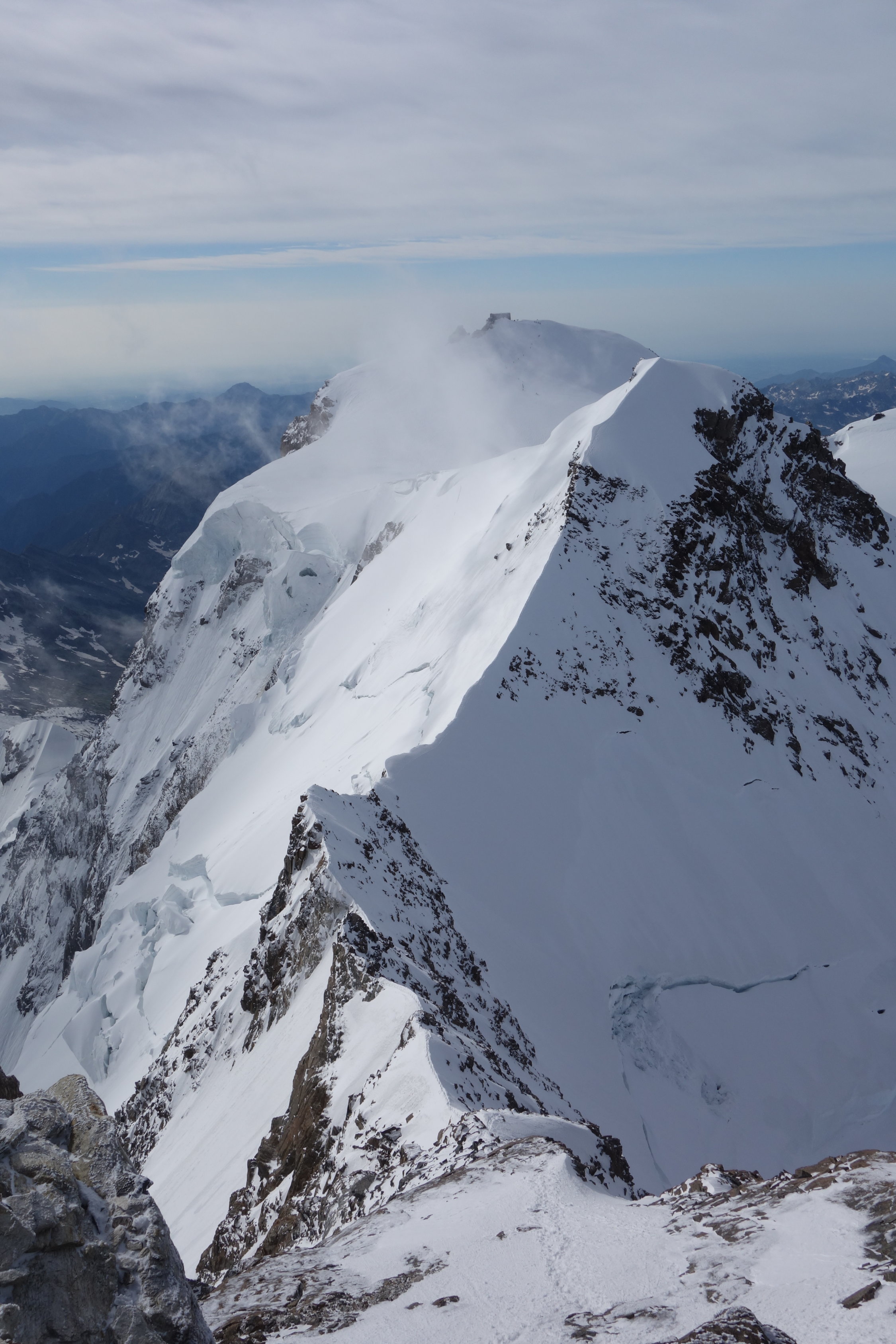 In der Nacht auf Sonntag gab es 10cm Griselpulver. Start gemütlich um 6:00 von der Margherita Hütte. Firngrate dank alter Tritte gut begehbar. Fels durch den Wind weitestgehend Schneefrei und trocken. Wir waren um 9:30 am Gipfel. 3 Seilschaften haben sich anschliessend abgeseilt zum Silbersattel, was uns zu abenteuerlich war, mann muss auch 30m abseilen können. Wir sind den Normalweg (Westgrat) abgestiegen und waren ca. 30min schneller. 40m Seil, 0.5, 1, und 2 Friend hatten wir dabei. Normalweg wurde heute 2 Seilschaften begangen, weitestgehend schneefrei.