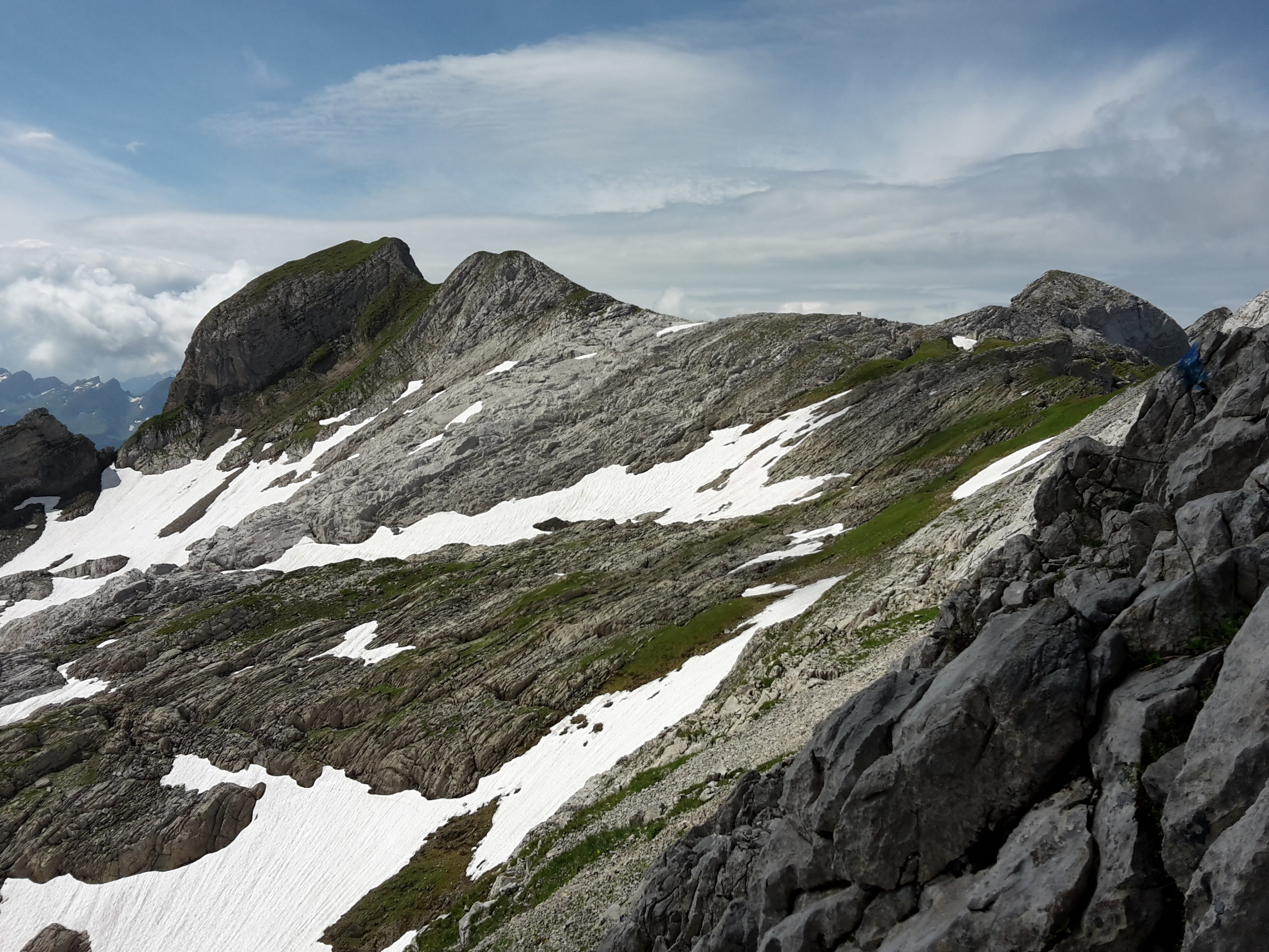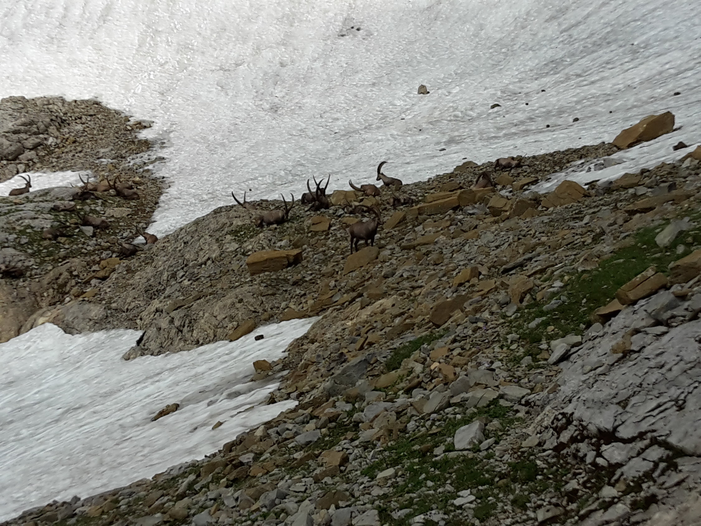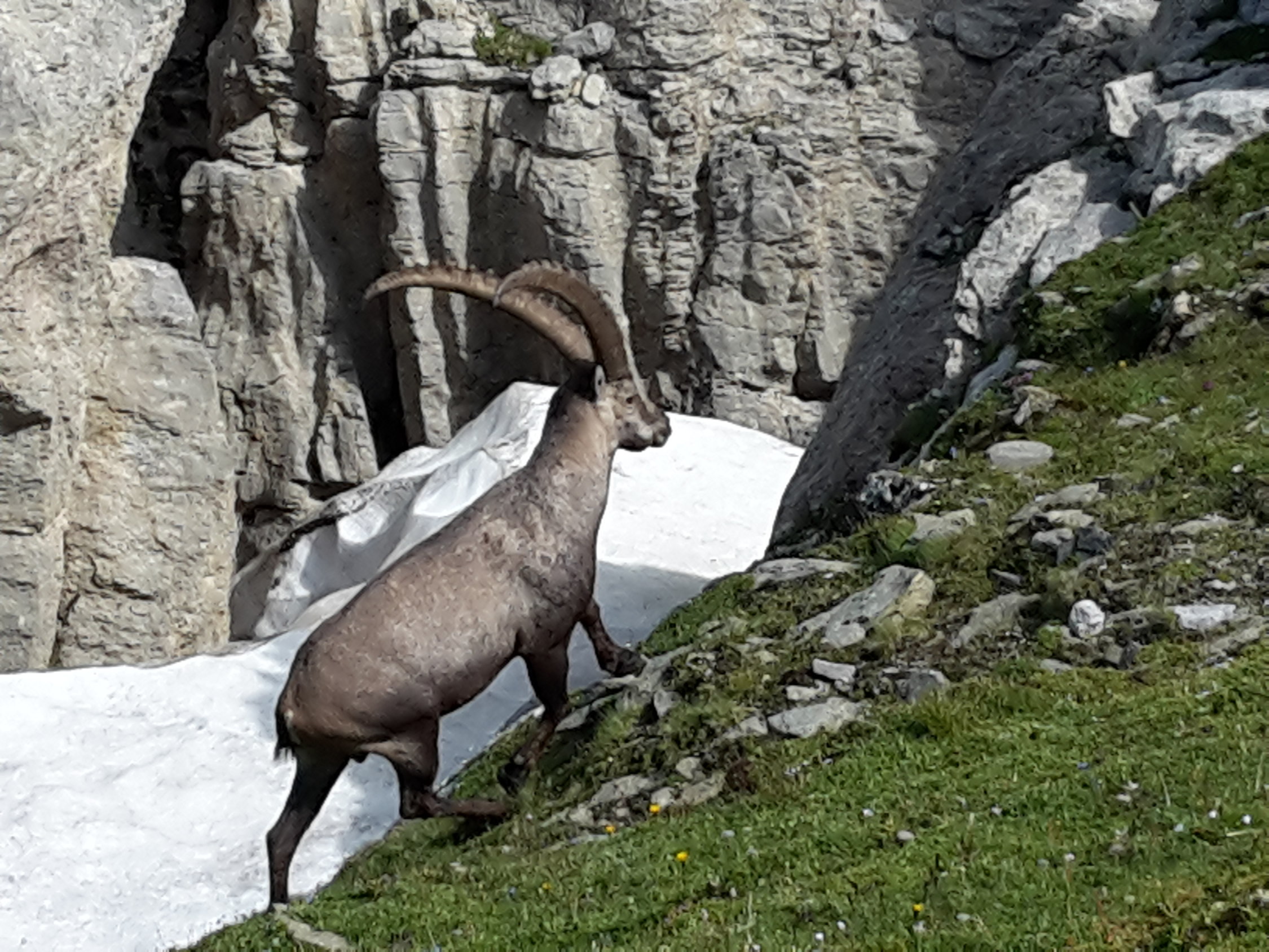 Start um 8:30 in Wildhaus, auf dem oberen Wildhauser Schafboden liegt noch das obligate (etwas mühsame) Schneefeld, sonst ist die Route schneefrei (die Route zum Schafberg führt z.Z. immer noch über ein Schneefeld), im Aufstieg durch die geröllige Halde zum Jöchlisattel wurde ich von einem jungen Steinbock überholt, man wird halt älter ... Steinböcke waren überhaupt sehr zahlreich, im Abstieg war eine 25 köpfige Herde beim "sünnele" anzutreffen. Der Nädligergrat verlangt etwas Vorsicht und Trittsicherheit, ist aber unschwierig. Abstieg zur Zwinglipasshütte für einen Boxenstopp und dann via Alp Tesel und Gamplüt zurück nach Wildhaus.