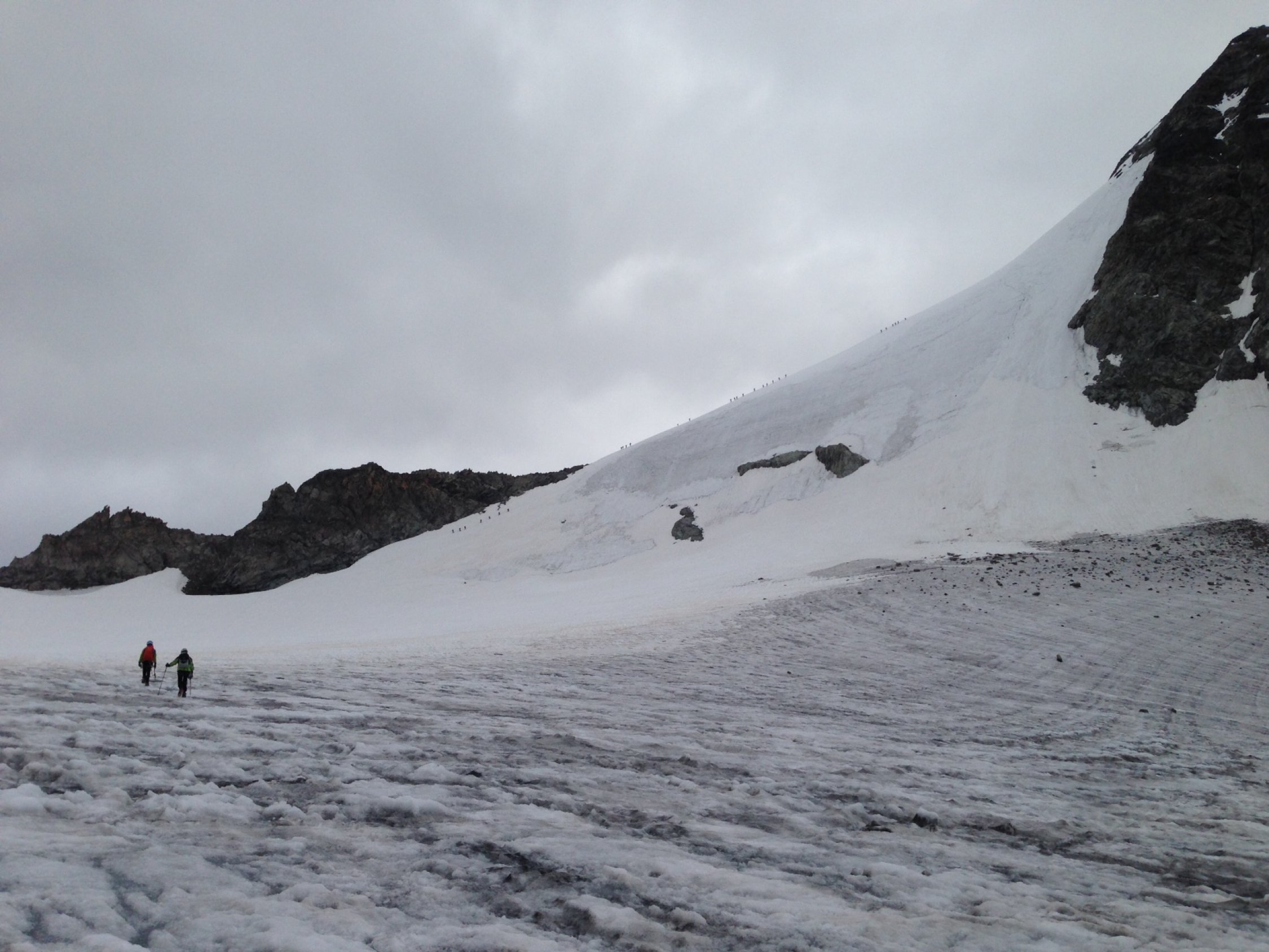 Mit den warmen Temperaturen dürfte die Steilpassage auf 3350 bis 3400 schon bald ganz aper sein, so dass dort entweder Stufen geschlagen werden müssen oder hochsteigen auf den Frontzacken angesagt ist, sowie allfällige Sicherung mittels Eisschrauben Sinn machen.