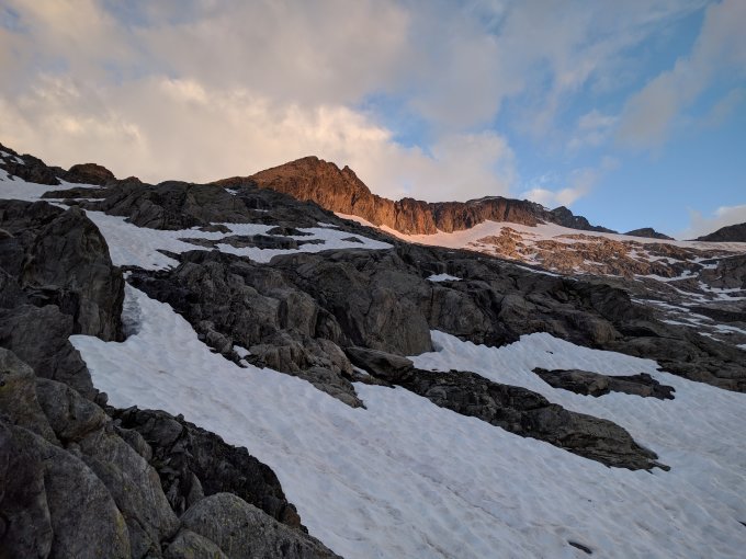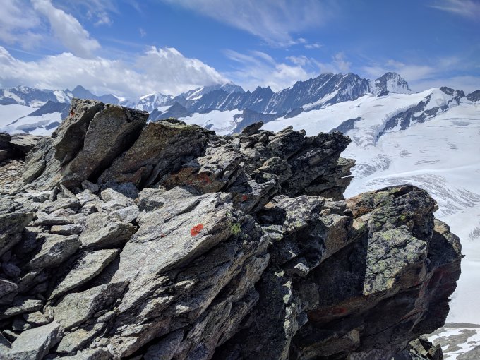 Zustieg zum Grat noch teils über Schneefelder, ab Punkt 2820 schöne Gratkletterei trotz zweimal kurz Nieselregen. Der Firn war dann entsprechend weich.