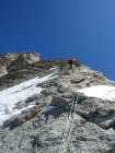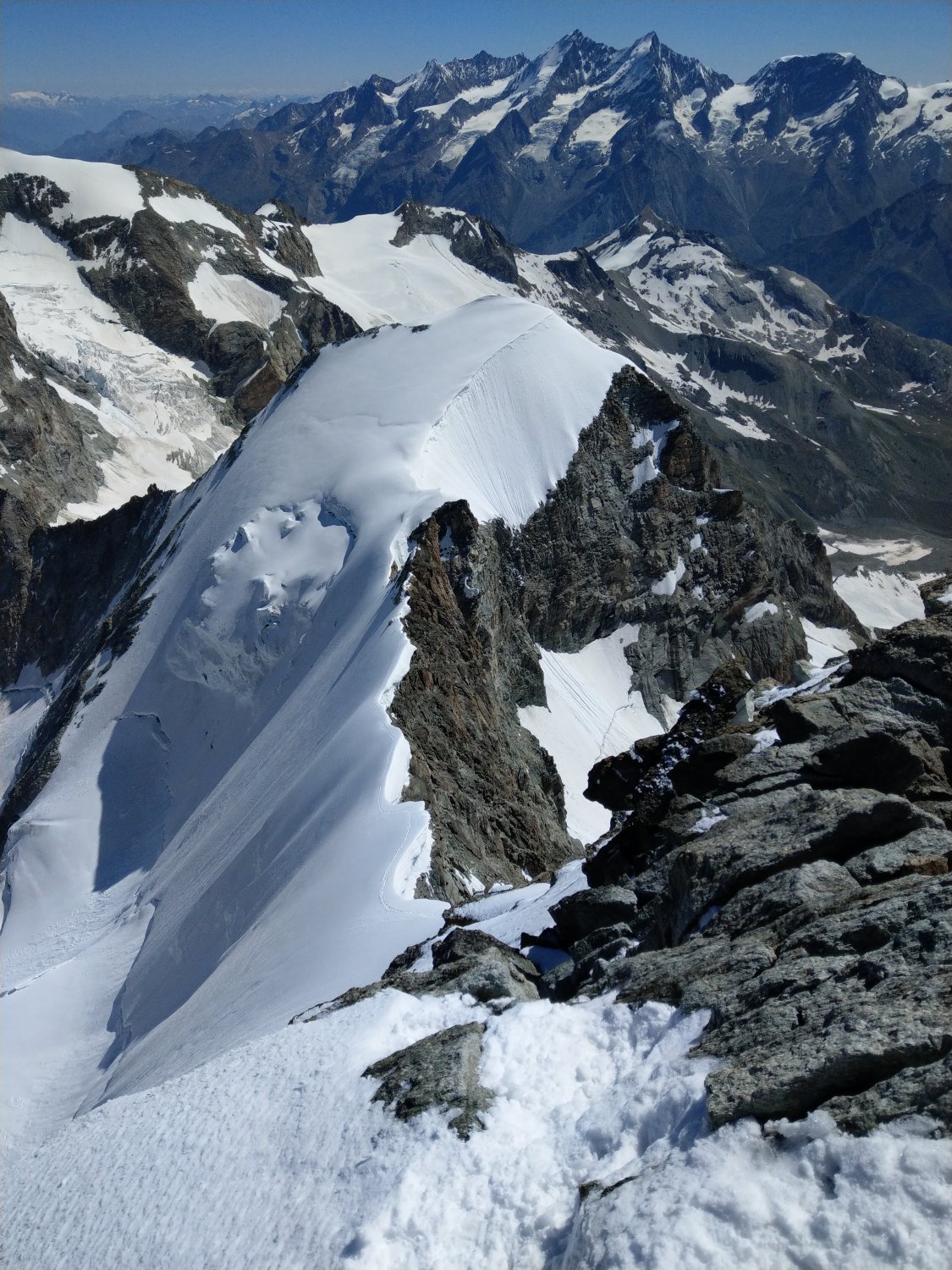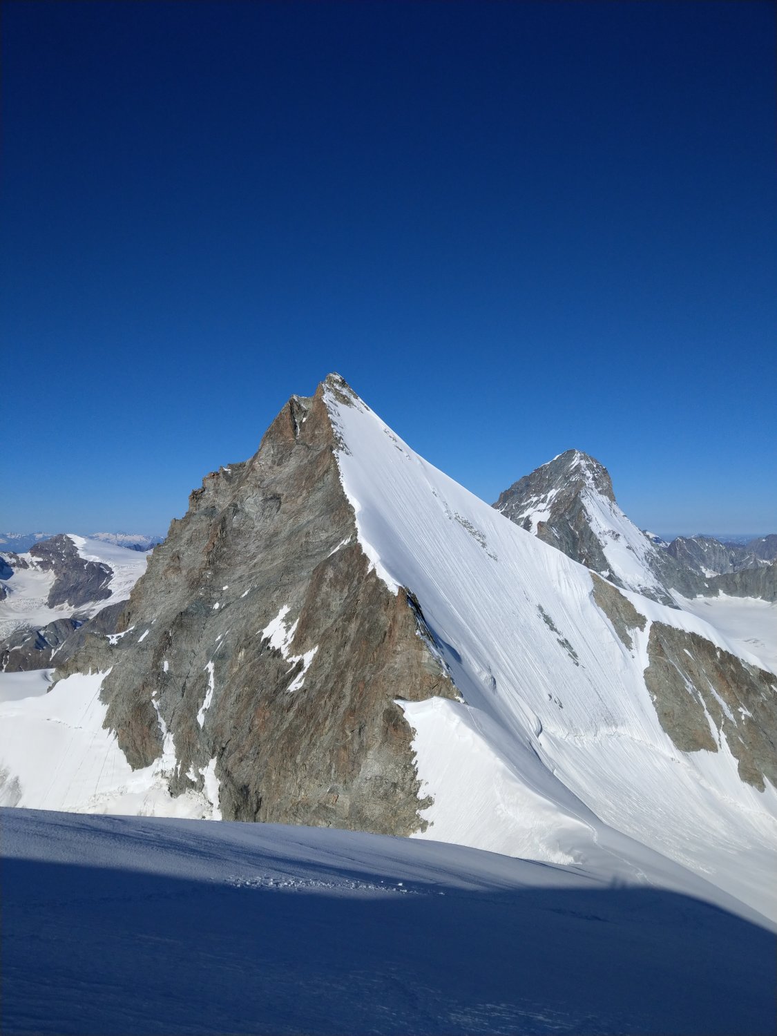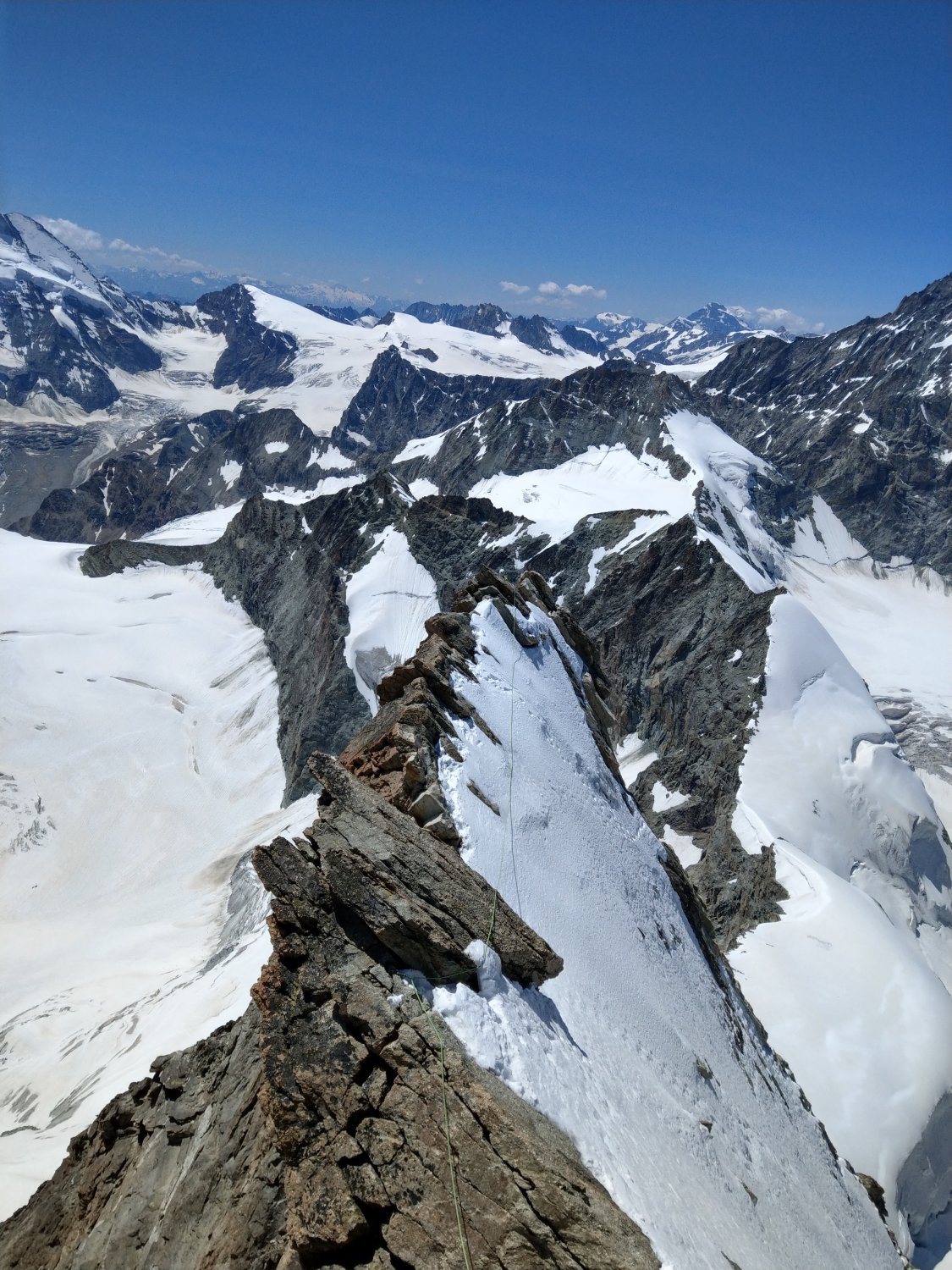 Überschreitung von Rothornhütte in Schönbielhütte. Aufstieg zur Wellenkuppe im unteren Teil brüchig, oberstes Drittel hingegen Genusskletterei im soliden Granit. Guter Trittfirn ab Wellenkuppe. Gendarm mit neuen Tauen ausgerüstet. Etwa 100m unter Gipfel spannender 5m Off-Width-Riss. Haben ihn gepiazt, was mit Steigeisen doch leicht den Puls erhöht. Auf Gipfel heute etwa zehn Seilschaften - etwa je drei hoch von Coeur und Arbengrat sowie rund fünf via Wellenkuppe. Waren einzige Seilschaft die Arbengrat im Abstieg nahm. Brauchten viel Zeit, da Steigeisen nötig und wir mit 40m Seil immer wieder Abseilstände bauen mussten (ca. 15m Reepschnur verbaut). Abzweiger in Südflanke beinahe verpasst. Zufällig entdeckt, als ich fasziniert hochalpine Mäuse in der Südflanke beobachtete. Liegt auf etwa 3700m. Ist nicht markiert, aber eigentlich offensichtlich - Durchschlupf unter einem Block und auf einfaches Band, das 20m nach links wegzieht. Abstieg zum Arbenbiwak problemlos. Beschreibung im SAC-Auswahlführer "Hoch hinaus. 50 ausgewählte Hochtouren der Schweizer Alpen" ist hier sehr präzis und hilfreich. Zeitplan (deutlich mehr als gemäss Führer). 4.45 Rothornhütte, 11.00 Gipfel, 18.30 Arbenbiwak, 21.00 Schönbielhütte. Herrliche Überschreitung in zum Teil steilen Firn und meist sehr gutem Granit.