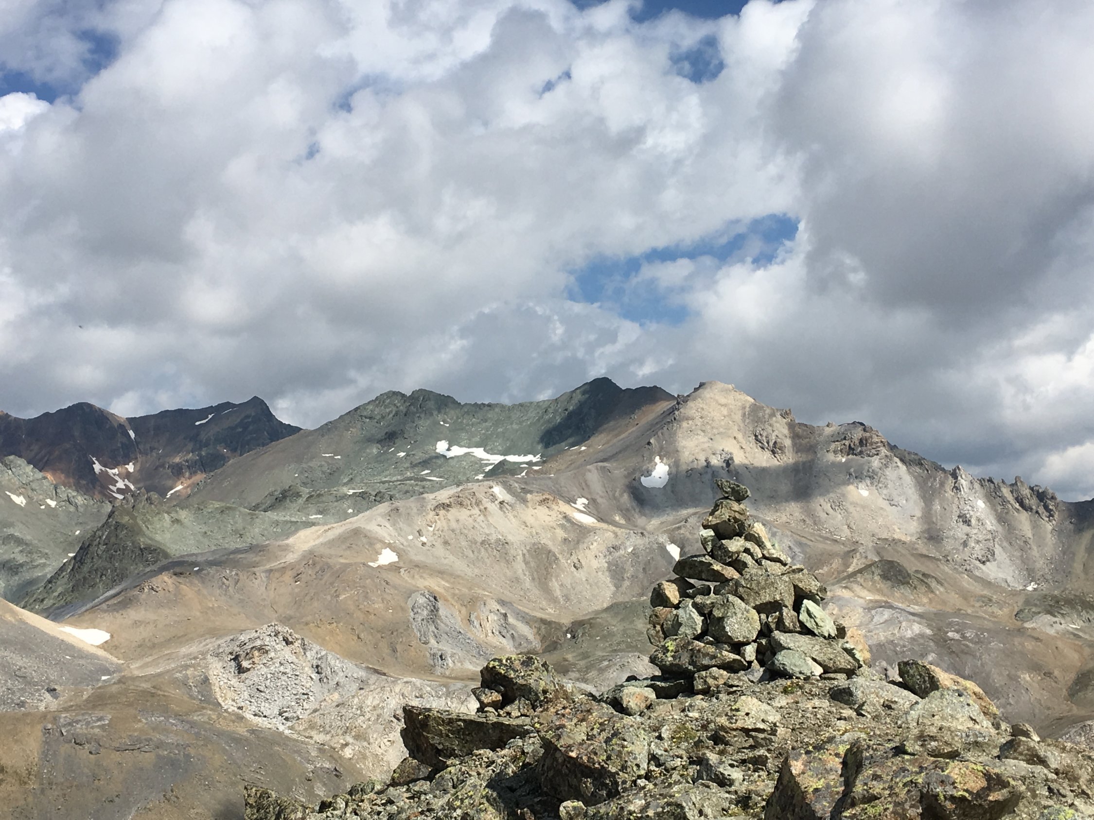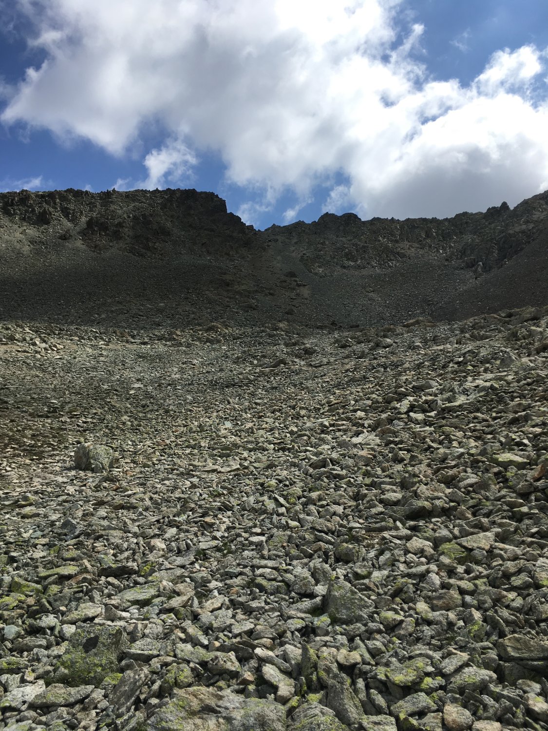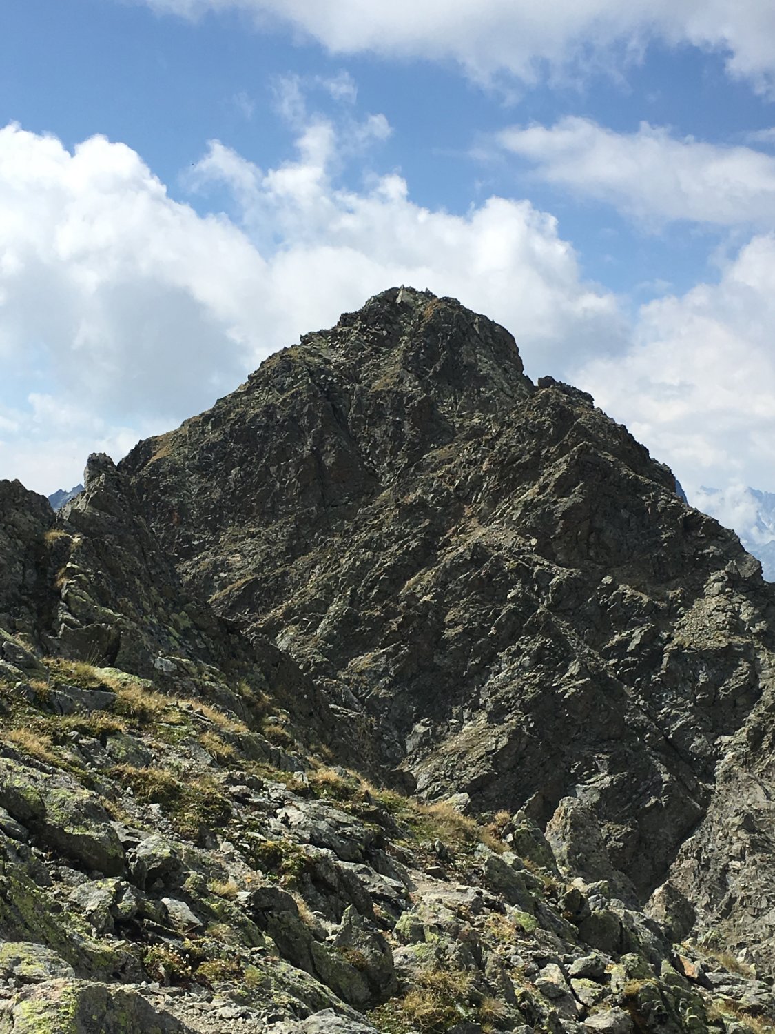 Ich wollte meine Skitour vom 28.4.18 noch fertig begehen (siehe Gipfelbucheintrag). Start um 07.30 Uhr Parkplatz Kurve vor Veduta. Windstill, einige Regentropfen, 12 Grad. Bis Höhe 2700 m angenehmer Aufstieg. Jetzt geröllig, ich habe gleich das erste steile Couloir auf Karte verdeckt durch Schrift Valletta genommen. Einige einfache Kletterstellen, solider Fels. Auf Plateau dann unschwierig auf Grat und kurze Traverse auf Ostseite des Vorgipfels und weiter auf den gerölligen Gipfel. Auf Karte stimmen die Dimensionen nicht, schlecht gezeichnet. Abstieg am besten wie Aufstieg, erstes Steinmännchen mühsames Couloir (Winterroute), zweites Steinmännchen Couloir mit festem Fels, aber etwas steiler.