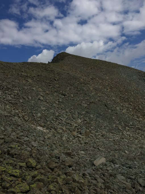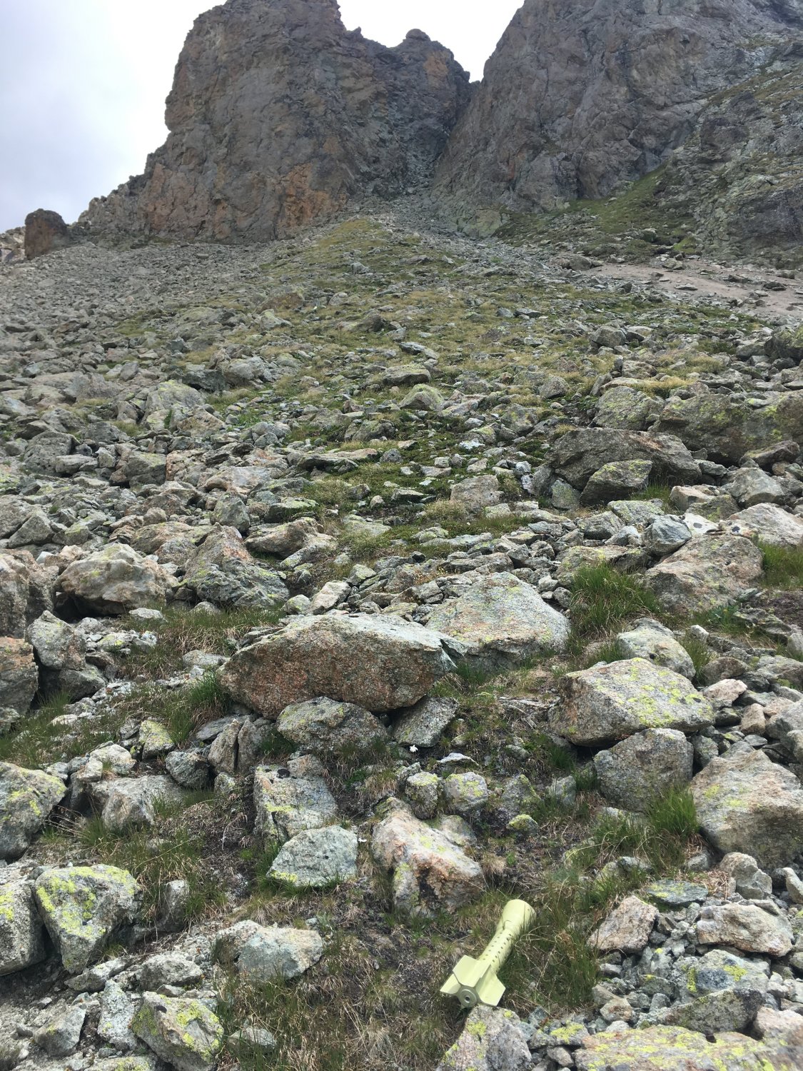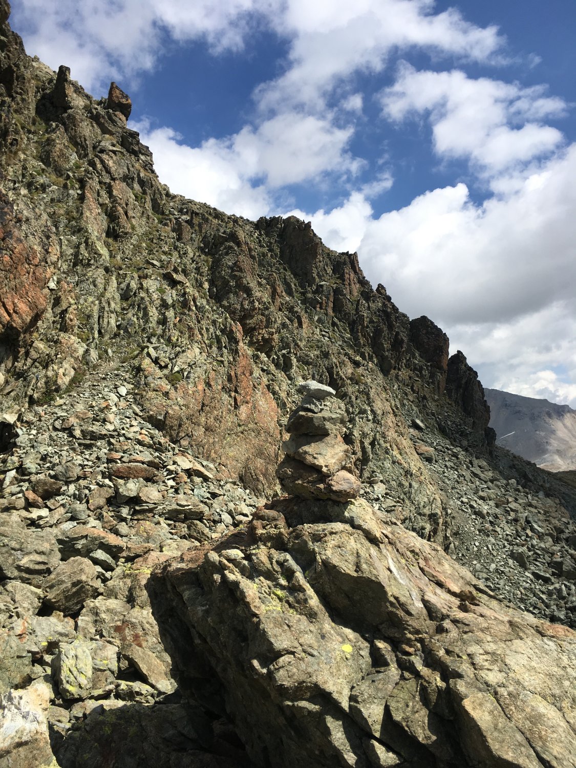 Ich wollte meine Skitour vom 28.4.18 noch fertig begehen (siehe Gipfelbucheintrag). Start um 07.30 Uhr Parkplatz Kurve vor Veduta. Windstill, einige Regentropfen, 12 Grad. Bis Höhe 2700 m angenehmer Aufstieg. Jetzt geröllig, ich habe gleich das erste steile Couloir auf Karte verdeckt durch Schrift Valletta genommen. Einige einfache Kletterstellen, solider Fels. Auf Plateau dann unschwierig auf Grat und kurze Traverse auf Ostseite des Vorgipfels und weiter auf den gerölligen Gipfel. Auf Karte stimmen die Dimensionen nicht, schlecht gezeichnet. Abstieg am besten wie Aufstieg, erstes Steinmännchen mühsames Couloir (Winterroute), zweites Steinmännchen Couloir mit festem Fels, aber etwas steiler.
