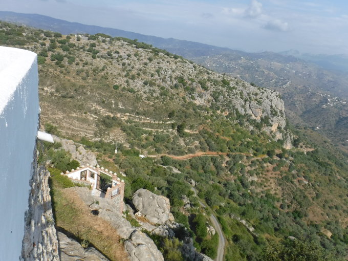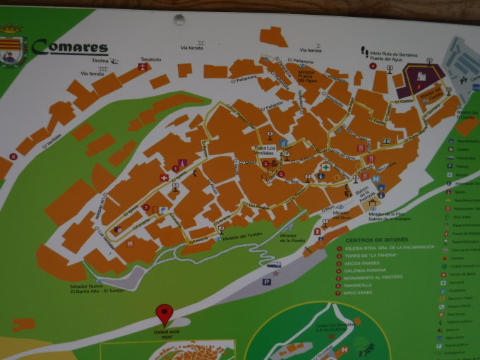 Lohnenswerter Abstecher durch verwinkelte Gassen in deren Pflasterung Keramikfliesen mit Fußabdrücken eingelegt wurden (10 min.) zum Kastel Nuestra Señora de la Encarnación (725 m) im höchsten Bergdorf der Axarquía.