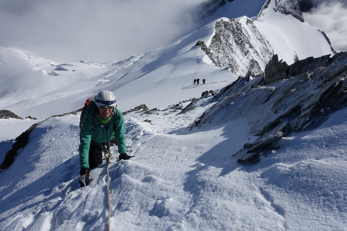 Wie auf den Bildern zu sehen ist, wurden wir am Sonntag mit top Wetter belohnt. 2 Schweizer starteten früher, da sie zum Nadelgrat wollten, mit uns sind noch 2 3-Seilschaften in Richtung Nadelhorn gestartet. die anderen Gäste auf der Hütte gingen keinen Gipfel an. Zu den Bedingungen auf der Route ist nicht viel zu sagen. Wie auf den Bildern zu sehen ist, hatten wir beste Verhältnisse bei wolkenlosem Himmel über einem großen Wolkenmeer. Einfach phantastische Bedingungen. Der letzte Aufschwung zum Gipfel hatte eine recht gute Trittspur und war problemlos zu machen. Ansonsten gibt es ja keine Schlüsselstellen. Auf dem Rückweg sind wir noch schnell aufs Ulrichshorn. Von hier hat man einen tollen Ausblick auf den ganzen Nadelgrat.