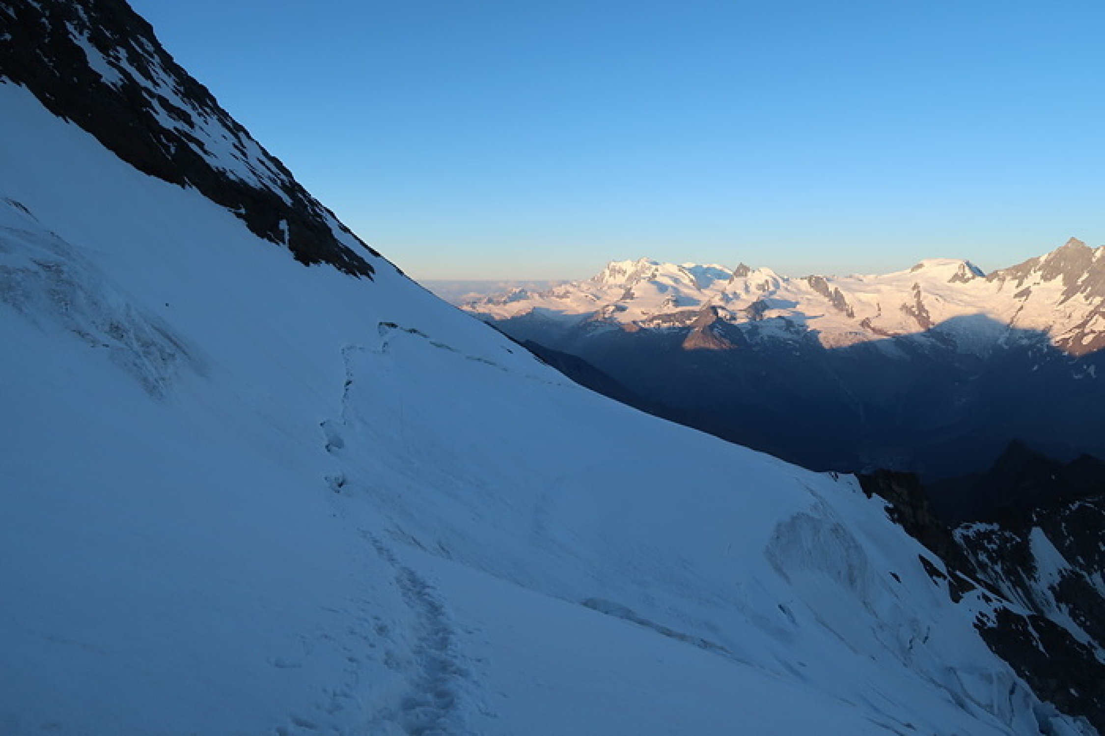 Im Aufstieg zum Fletschhorn sind beste Verhältnisse. Guter Trittschnee. Abstieg zum Fletschjoch ebenfalls beste Verhältnisse. Kein Eis vorhanden.