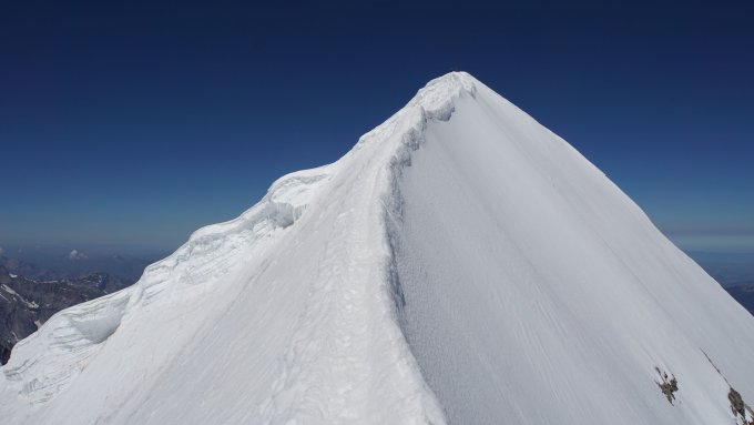 Sensationelle Verhältnisse am Mönch. Nur am Gipfelgrat ist auf einen kurzen Teilstück gutes Gleichgewicht gefragt da dort die Wächte fehlt. Die Felsen schön trocken und am Einstieg wird wegen der Schneeschwund das "Wändli" immer höher.