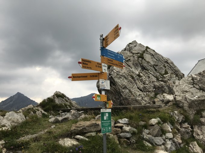 Am Vorabend ging ich von Malbun über die Tälihöhe zur Pfälzerhütte. Wegen einem drohenden Gewitter schaffte ich den Weg, der mit 2:30 angeschrieben ist, in 1:30.