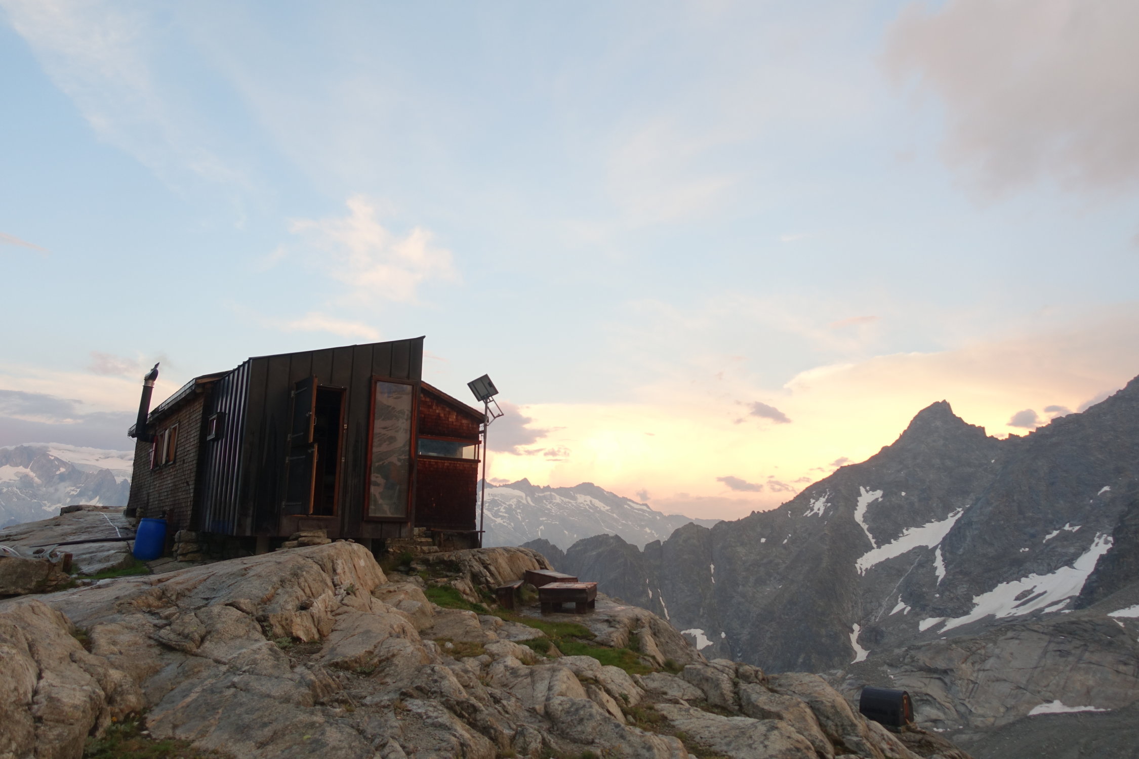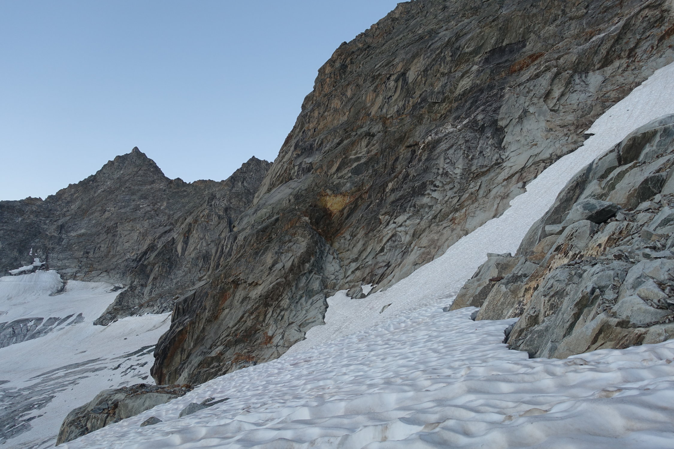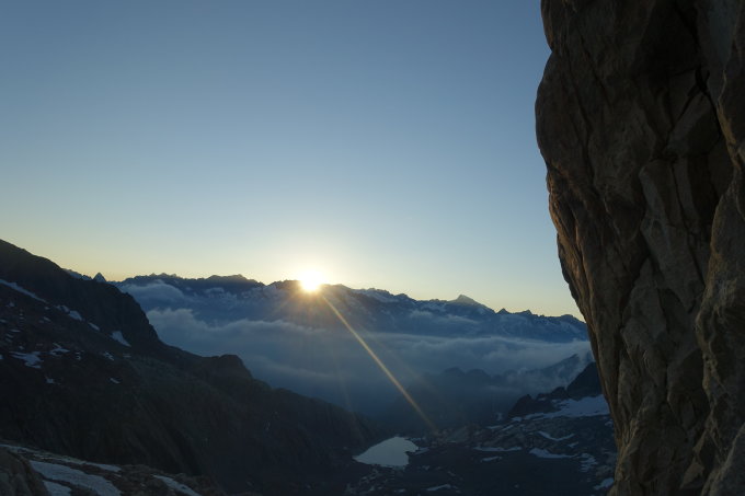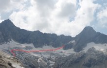 Bei den aktuellen Verhältnissen bietet sich der Zustieg über die Felsplatten nördlich der Hütte an (locker in einer Stunde machbar), noch keine Steigeisen nötig, Pickel war auf den letzten Metern zum Einstieg hilfreich. Jetzt anfangs August ist der Einstieg ab 6:50 Uhr in der Sonne. Das Couloir im Abstieg vom Südgrat ist fast komplett ausgeapert, mit 3x 25 m Abseilen lässt sich der Abstieg aber sehr sicher gestalten. Abstieg über den Gletscher zum Gruebensee (siehe Foto) aktuell sicher zeitaufwendiger als im Frühsommer wenn noch viel Schnee liegt, aber immer noch problemlos (anseilen empfiehlt sich trotzdem).