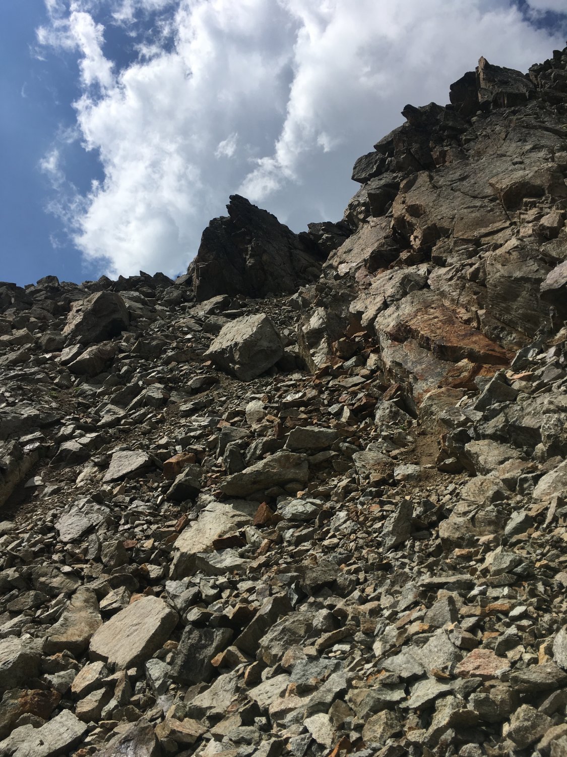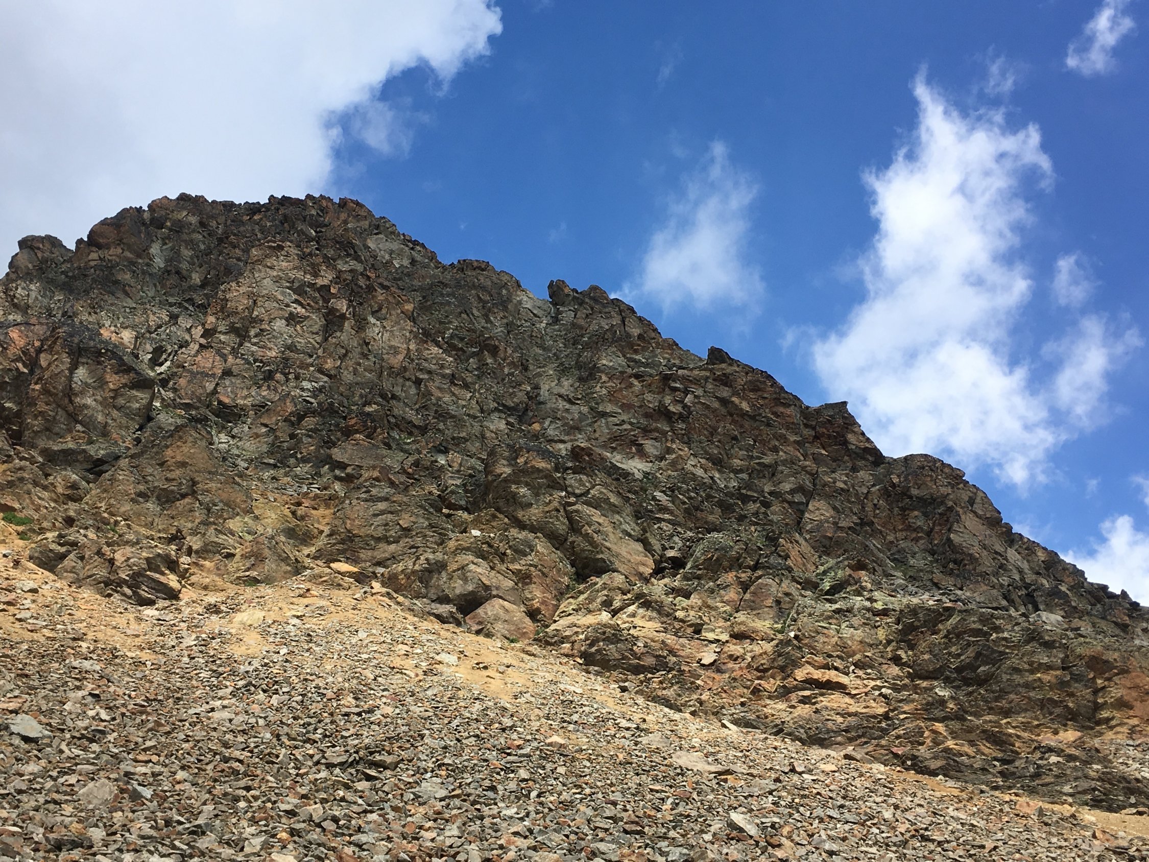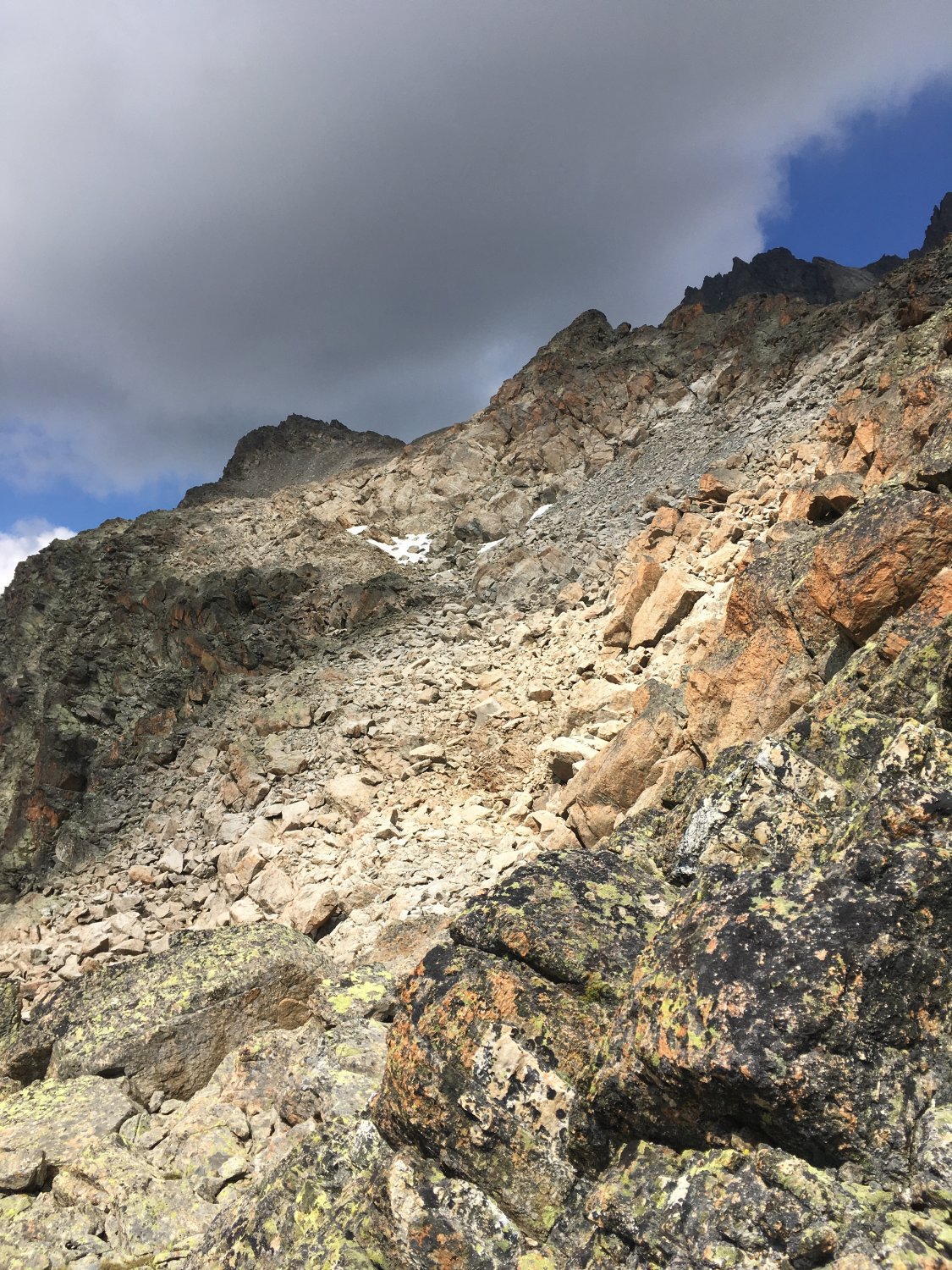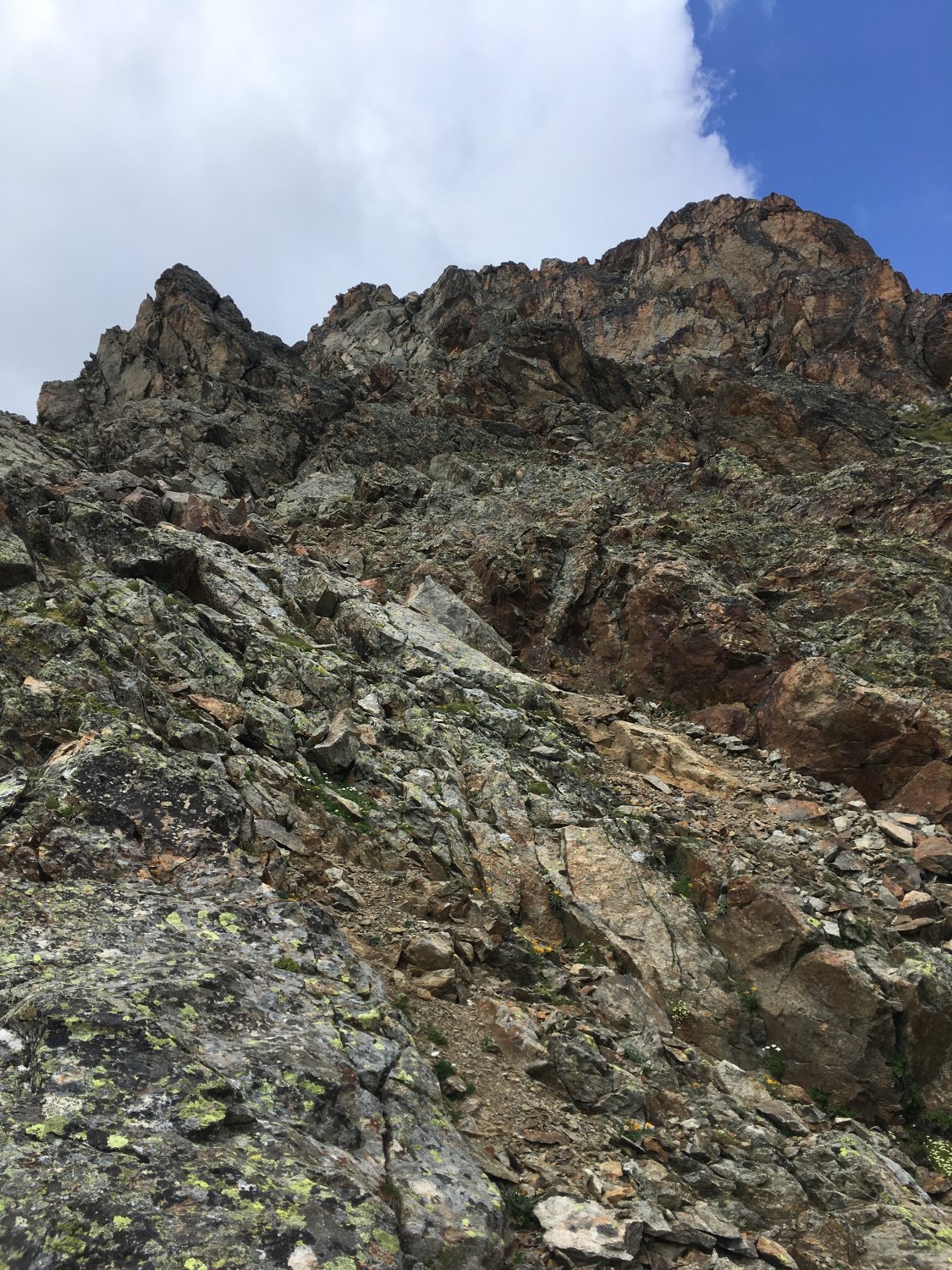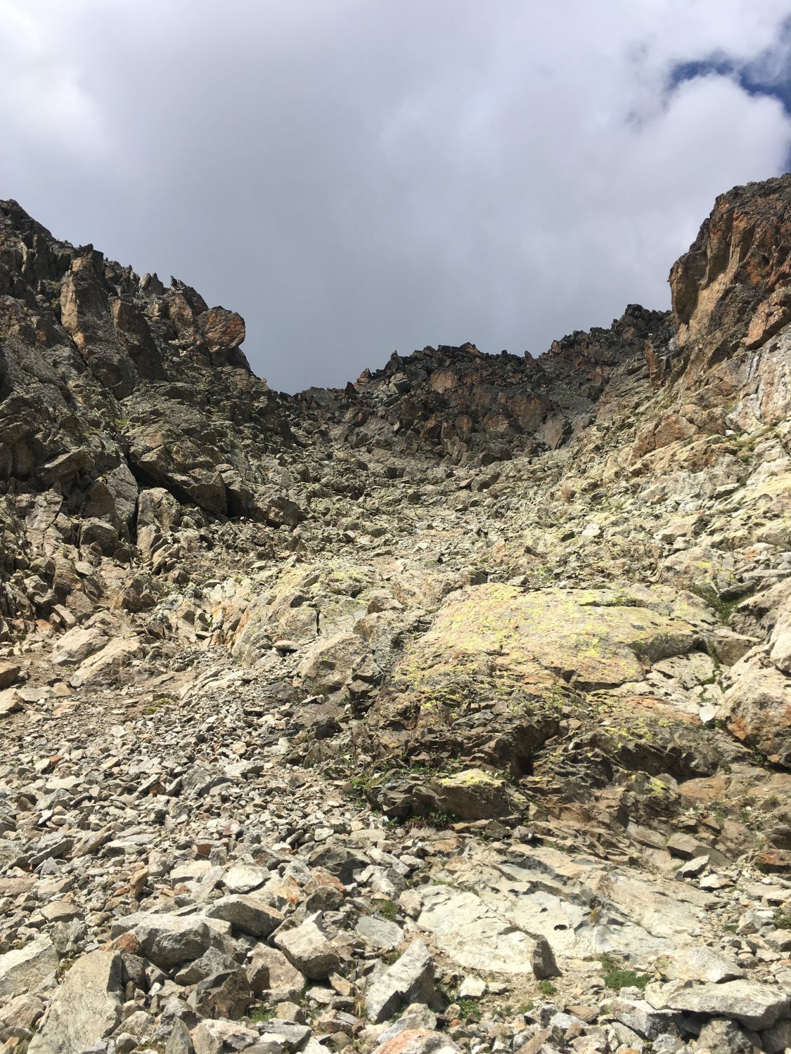 Start um 6.30 Uhr, 9 Grad, windstill. Bis P. 2777 angenehmer Aufstieg auf Wanderweg und Weiden. Ab P. 2777 markanter oranger Sand und im gerölligen Couloir viele lose Steine. Am besten hält man sich im Aufstieg rechs an soliden roten Felsen (T4). Ab P. 2987 Blöcke und Geröll, aber angenehm im Auf- und Abstieg. Keine technischen Schwierigkeiten. Abstieg wie Aufstieg. Die Tour kann auch ab Chamanna Es-Cha 2594 m gemacht werden (3 Stunden).