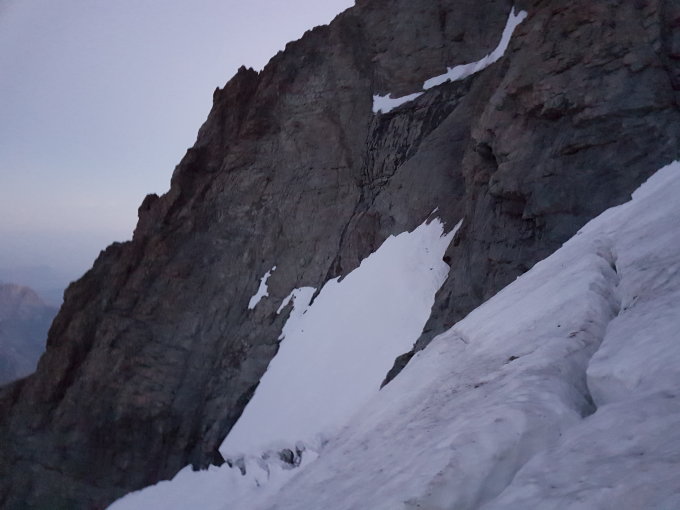 Der Einstieg ist dank der Koordinaten im Topo und der Sanduhrschlinge (siehe Bild) einfach zu finden. Allerdings kann der Zugang je nach Bedingungen schwierig bis unmöglich sein, da man den dort stark verspalteten Schreckfirn queren muss und einen mächtigen Bergschrund zu überwinden hat. Momentan führt eine gute Schneebrücke hinüber.