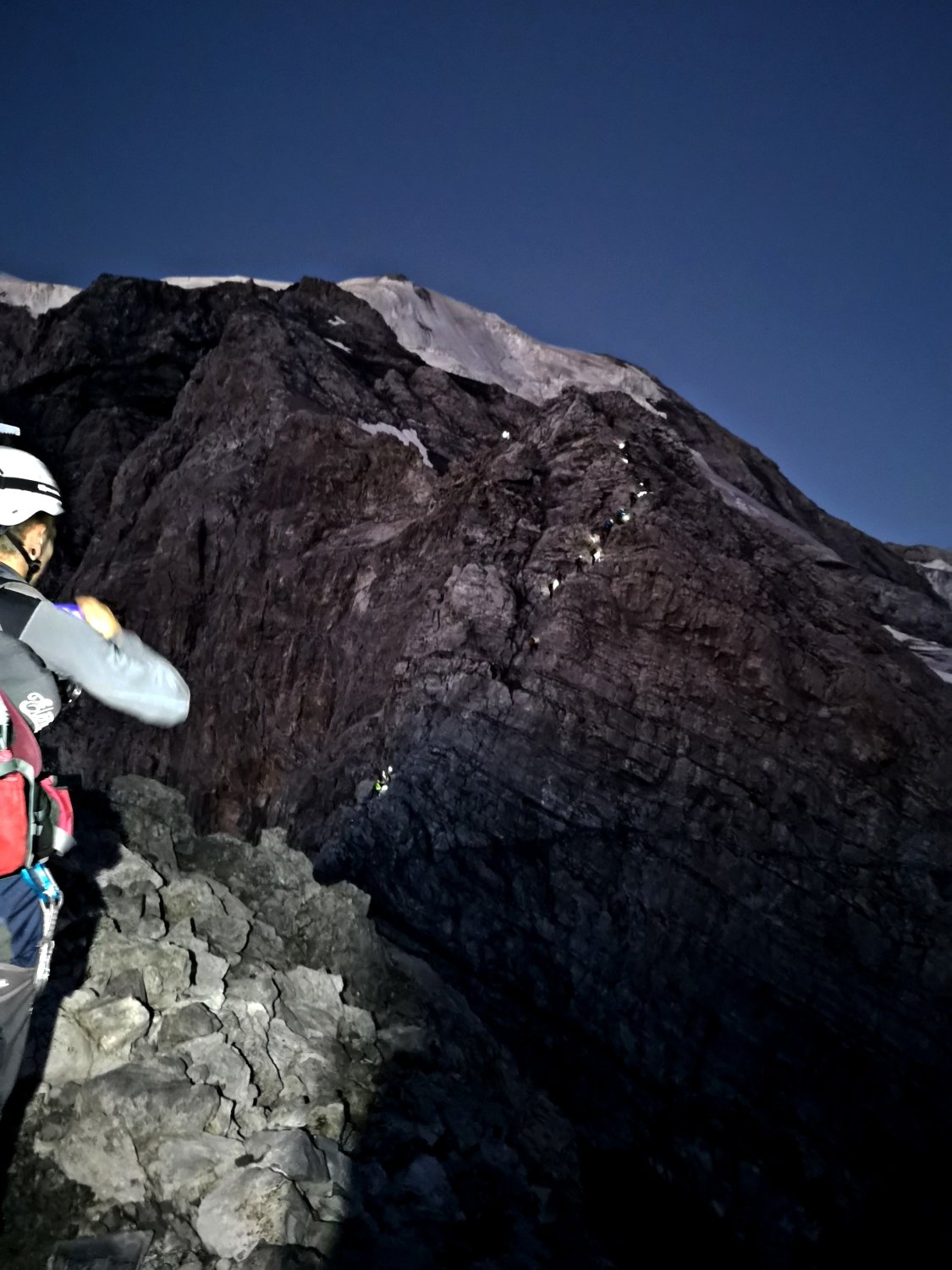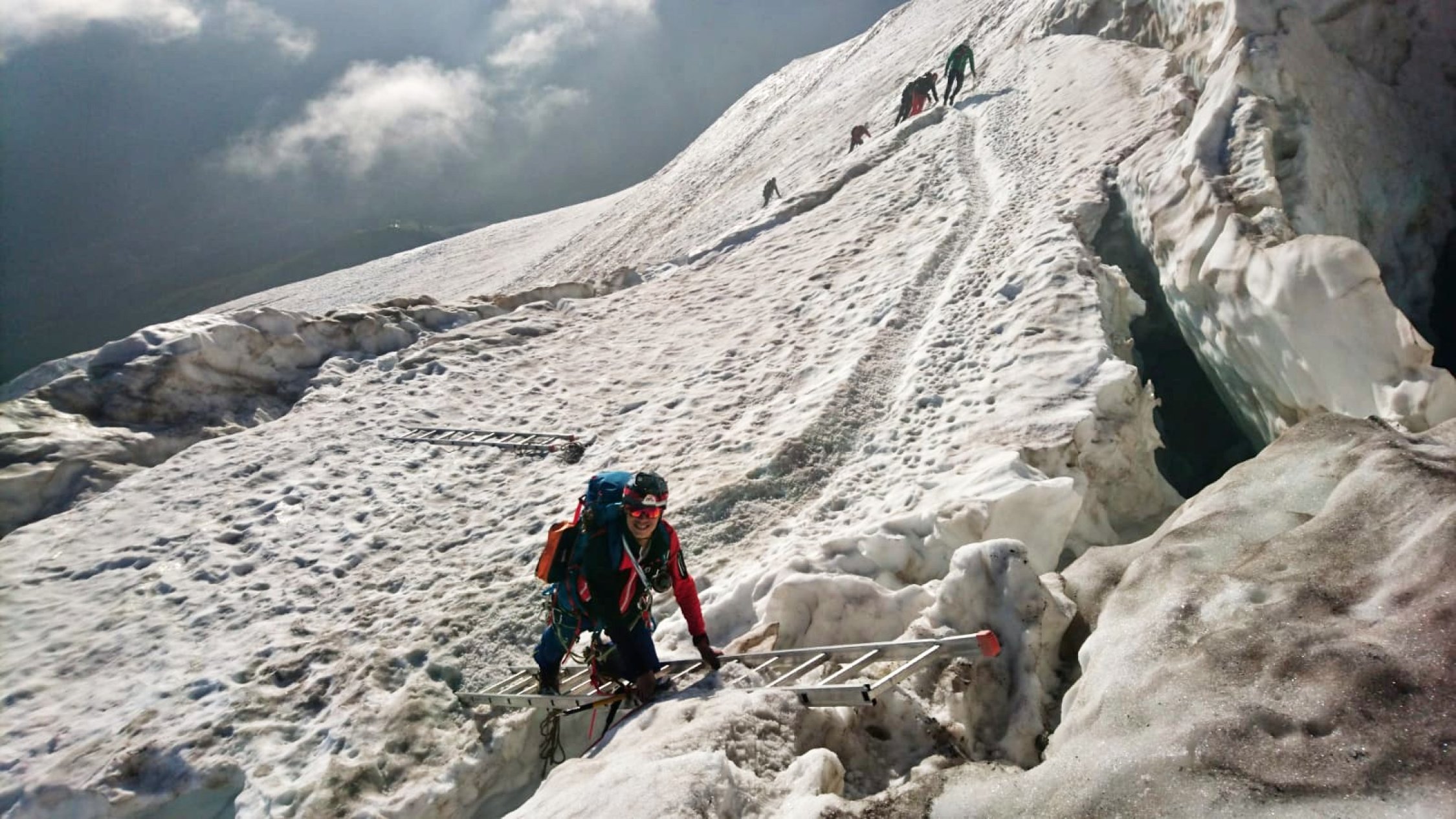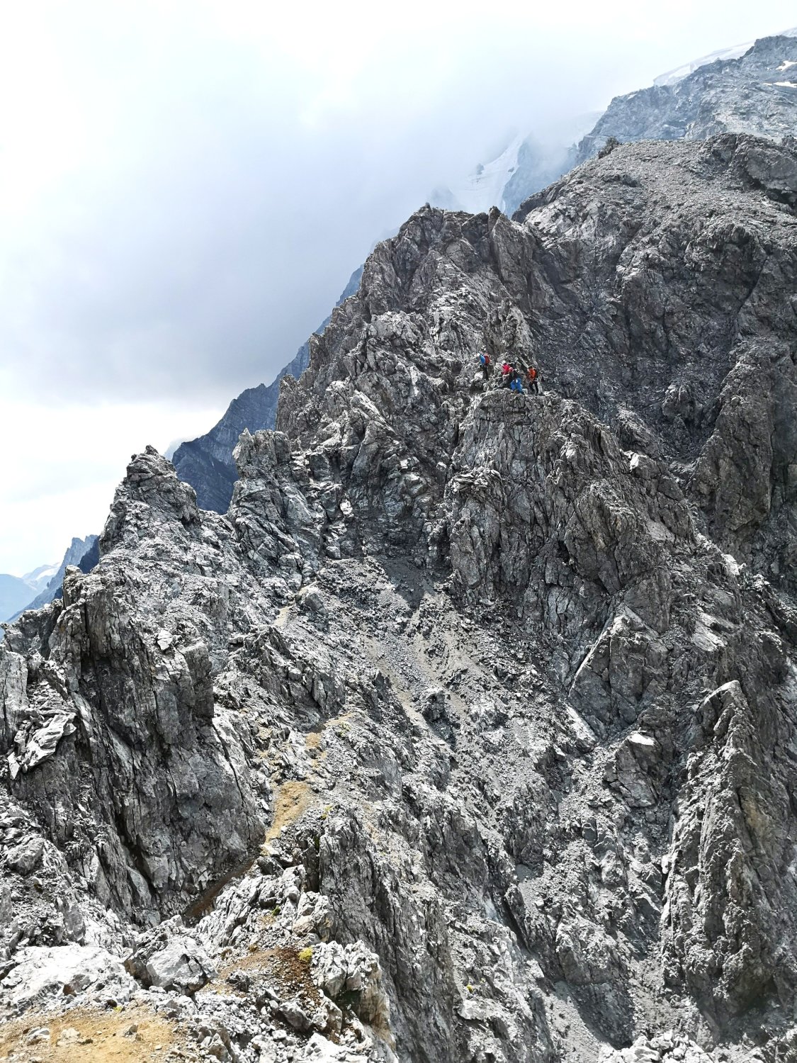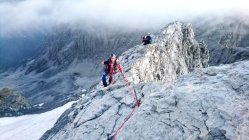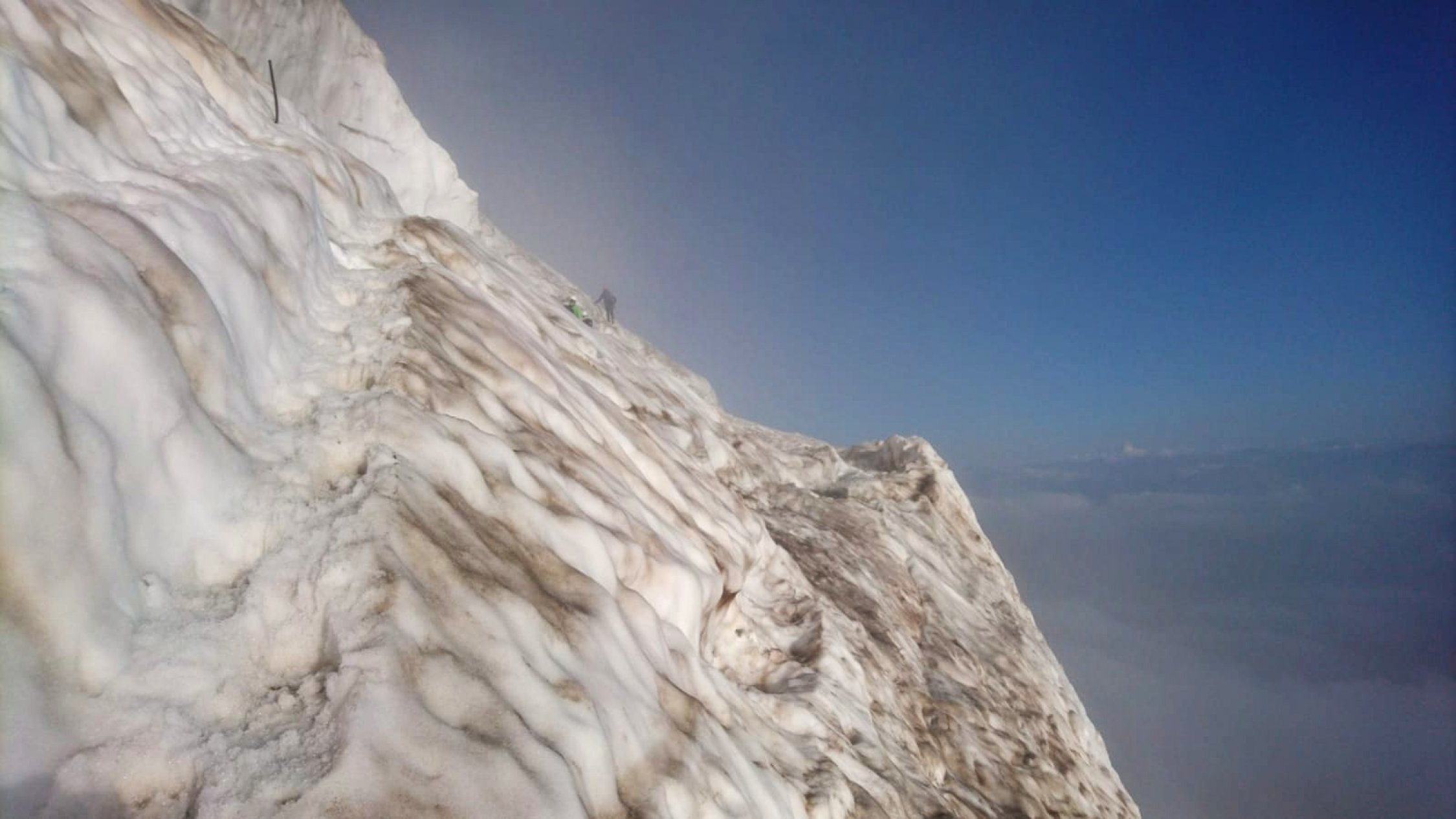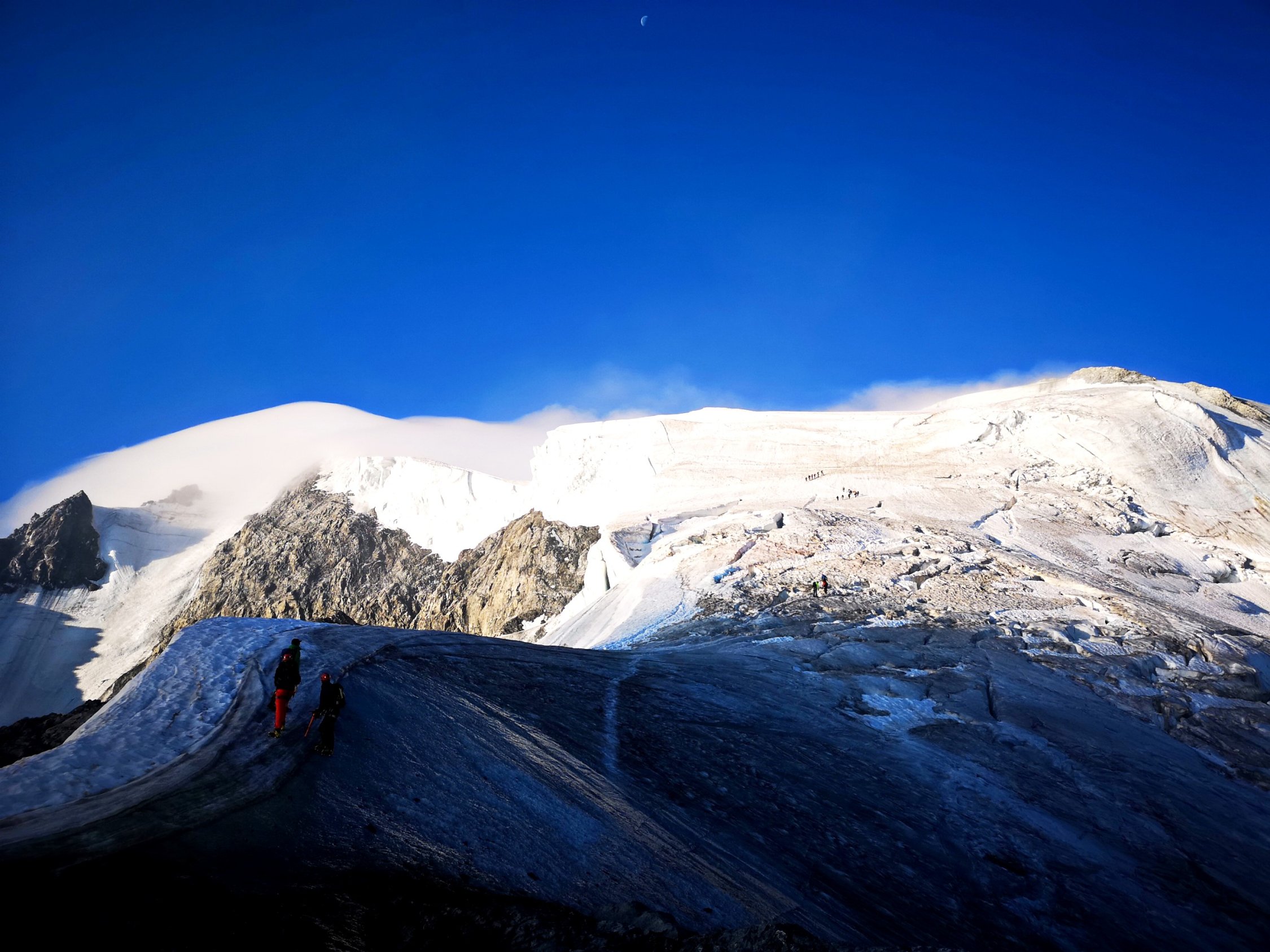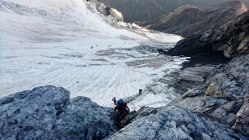 Grat Schneefrei, am Gletscher Spalten gut überschaubar, Bereits eine Leiter als Spalten Überbrückung vorhanden. Beim Abstieg ca. 09:00 Uhr schon eine unangenehme 2cm dicke weiche Schnee Auflage vorhanden. Stau an beiden Abseilpisten.