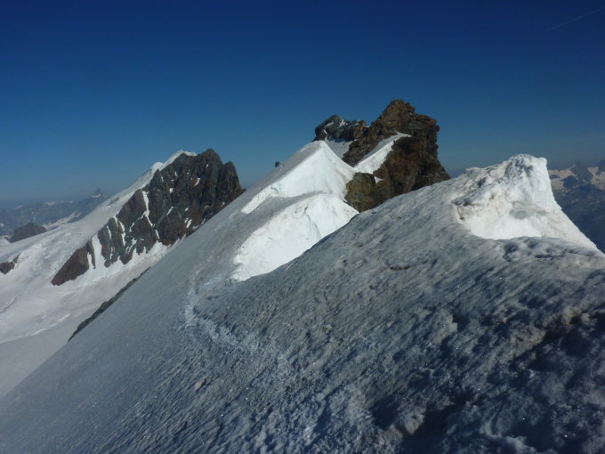 Zustieg vom Kleinen Matterhorn zur Roccia Nera in der Früh noch angenehm hart. Die Flanke auf die Roccia Nera wird zunehmend aper (aktuell noch gut zu gehen; max. 5m Blankeis). Alle Firnabschnitte auf der gesamten Überschreitung haben eine gute Spur. Der Fels ist schneefrei und sehr gut zu klettern. Für die Abischerung hatten wir einige Schlingen und die Camalots C4 0.3, 0.75 und 2 dabei. Ein oder zwei mehr sind bei der direkten Variante auf den ersten Aufschwung nicht verkehrt.
