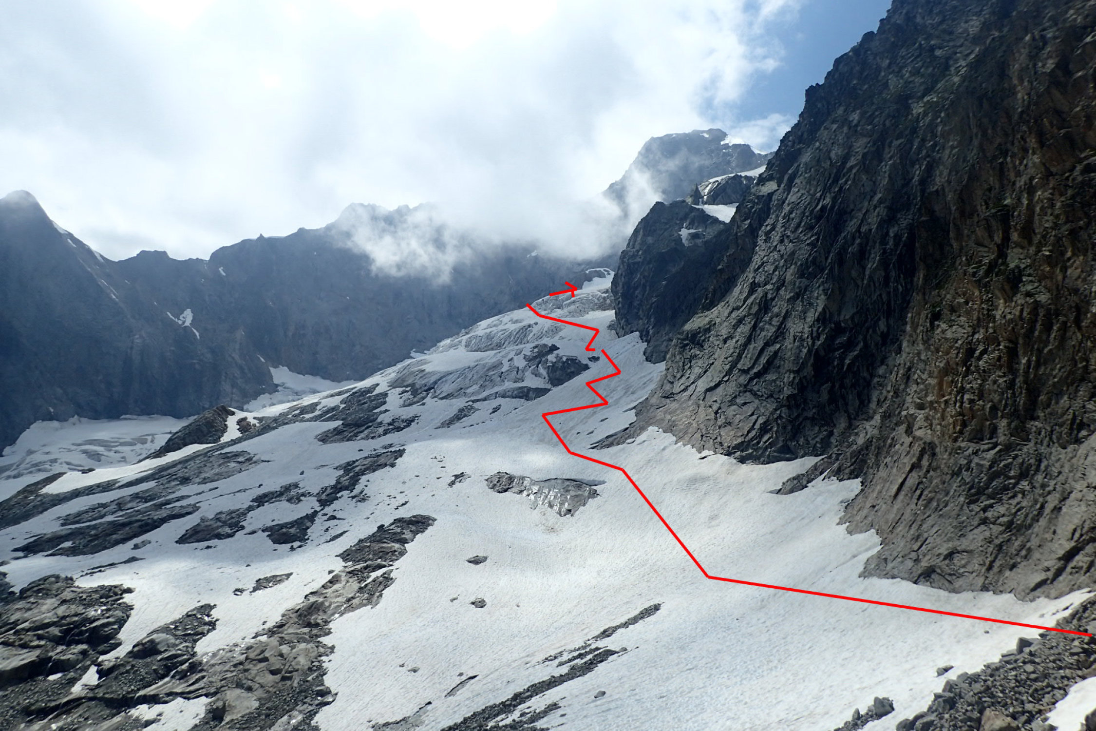 Der Zugang zum Gallet-Grat, wie im SAC-Führer "Hochtouren im Wallis" beschrieben, ist definitiv nicht mehr machbar (Gletscherrückgang). Es bieten sich die im Silbernagel-Führer erwähnten Varianten über den (von unten) rechten Rand des Glacier du Dolent an.