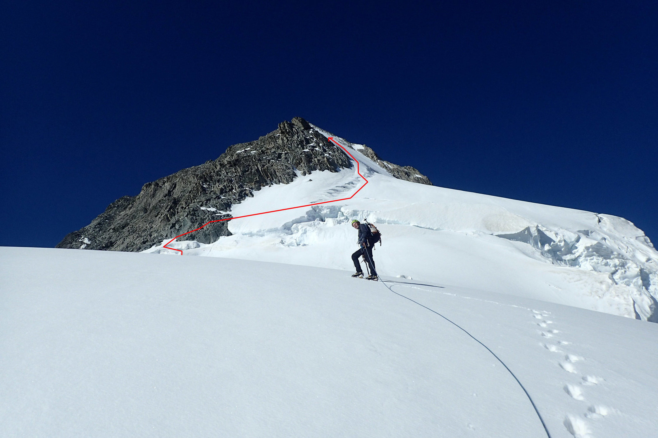 Der Bergschrund auf ca. 3600m weist nur noch eine dünne Schneebrücke auf, kann aber links in den Felsen umgangen werden. Dann guter Trittschnee/griffiger Firn bis in die Gipfelfelsen.