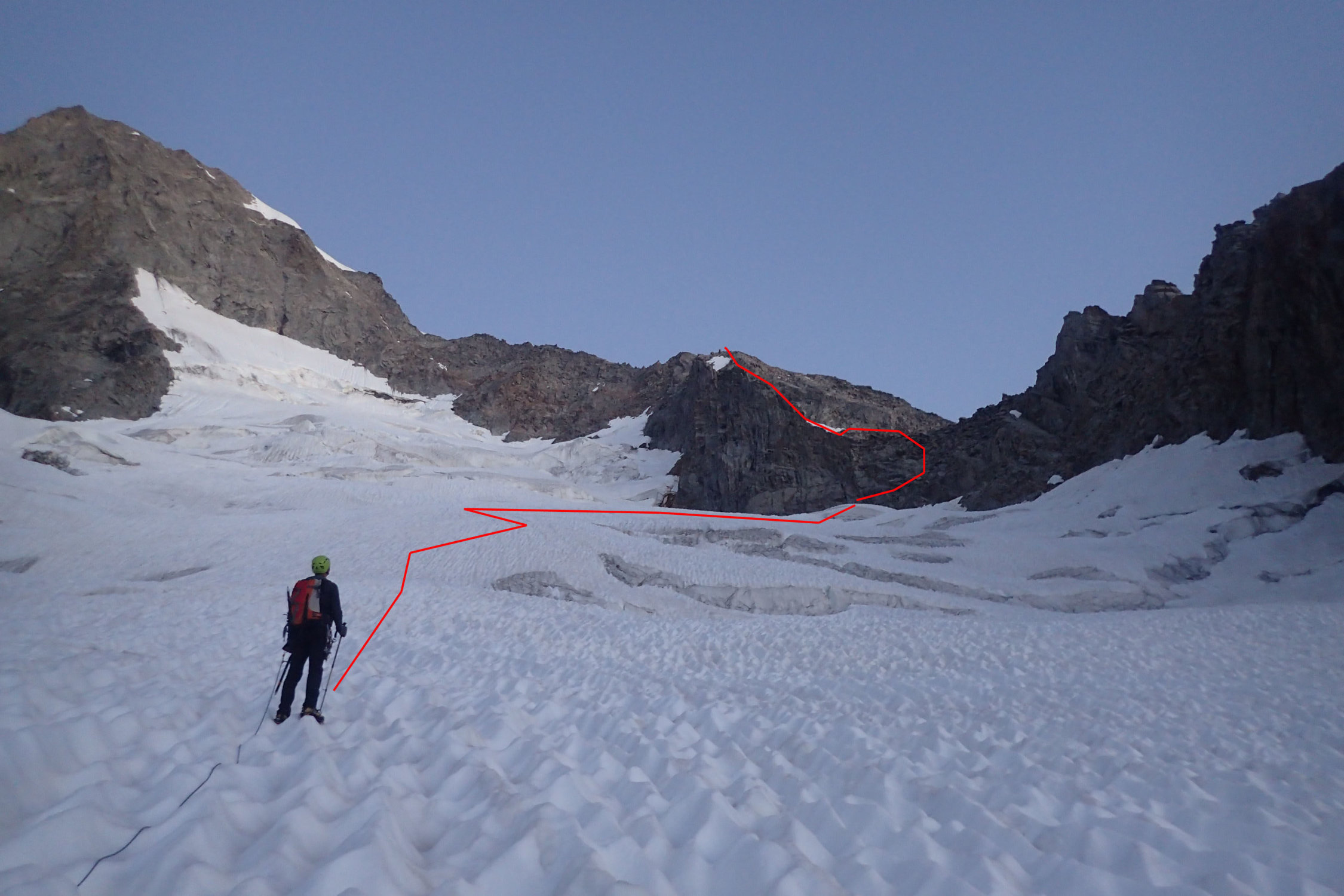 Oberhalb 3400m einfache Querung auf den Gletscherteil des Grats.