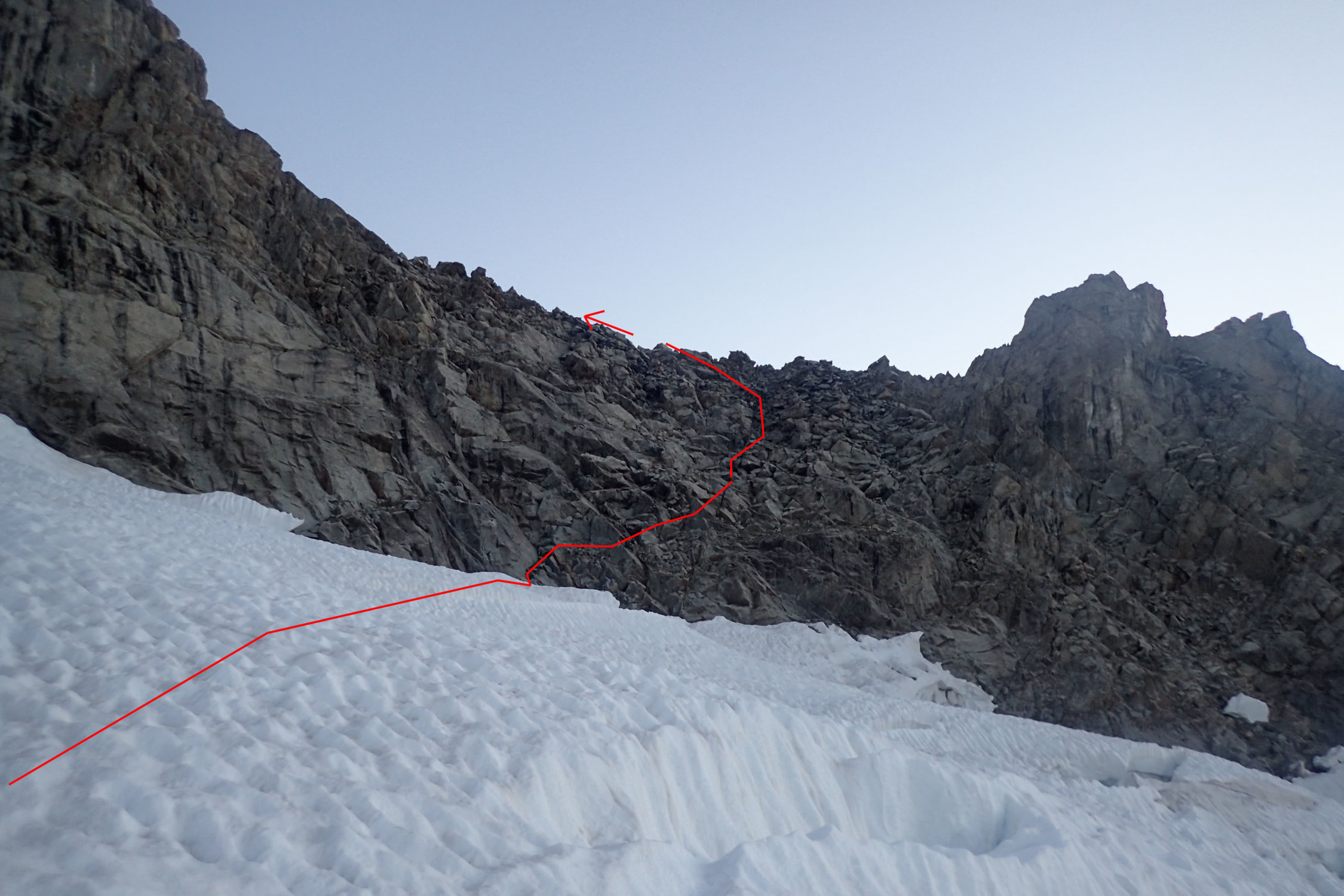 Angesichts der bereits stark fortgeschrittenen Schneeschmelze und der weit geöffneten Spaltenzonen im oberen Bereich, haben wir von der oberen Variante abgesehen und sind auf ca. 3150m vom Gletscher in die Randfelsen gestiegen. Der Aufstieg zum Sattel im Ost-Ast des Gallet-Grats ist hier relativ einfach (Bänder und Blockkletterei II). Der nachfolgende exponierte Gratabschnitt, der früher wohl auch noch schneebedeckt war, verlangt dann allerdings Kletterei mit kurzen Passagen im 4. Grad an nicht immer lupenreinem Gestein (Friends nützlich).