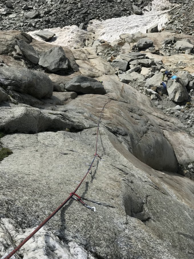 Zustieg: Der Gletscher traversiert man auf der Schutthalde (Abzweigung vom weg zur Siedeln-Hütte mit Steinmänner markiert). Um die Hanimoon zu klettern, empfiehlt sich den Vorbau von links anzupeilen (die Routen rechts kann man besser von rechts erreichen).