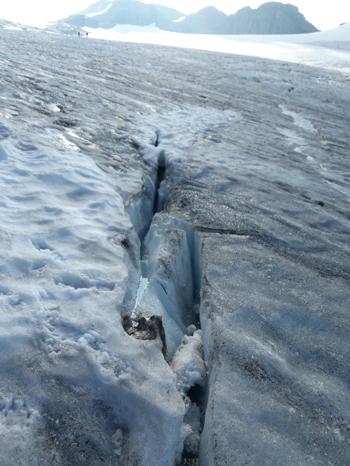 Alles sehr trocken und heiss bis zum Gletscher. Auf dem Gletscher alle Spalten gut sichtbar. Steigeisen waren wertvoll für ein schnelles Vorwärtskommen auf dem Gletscher.