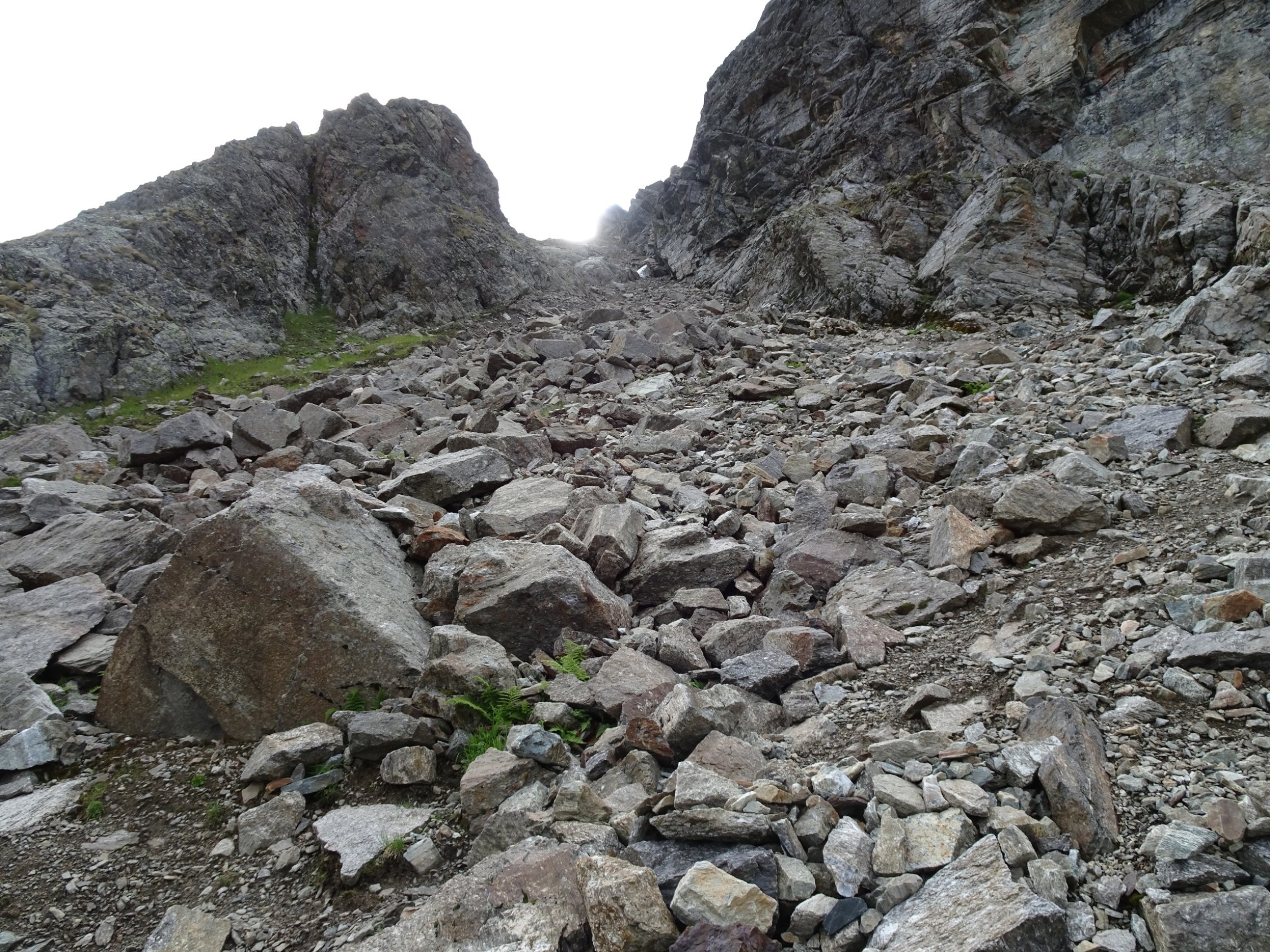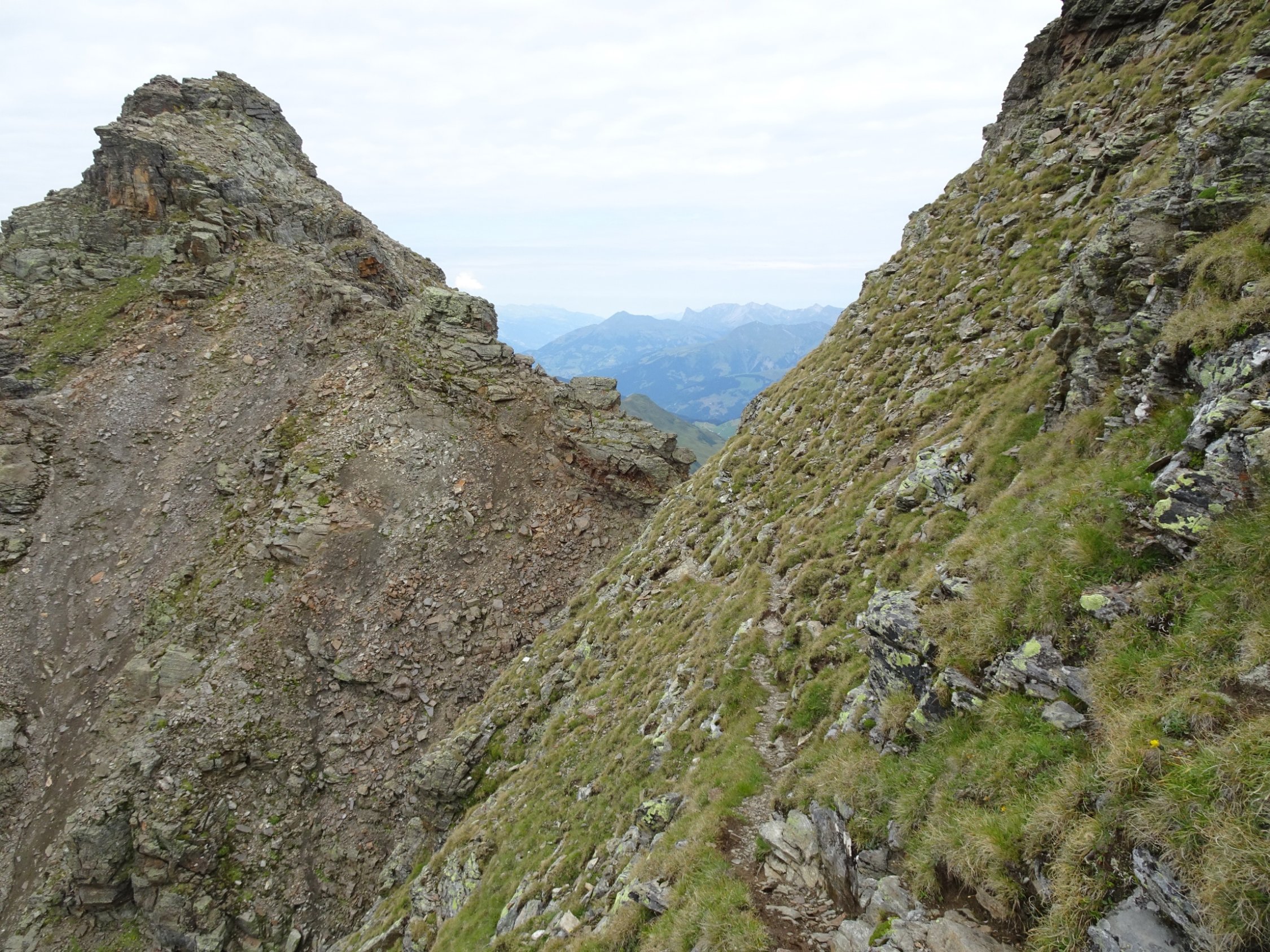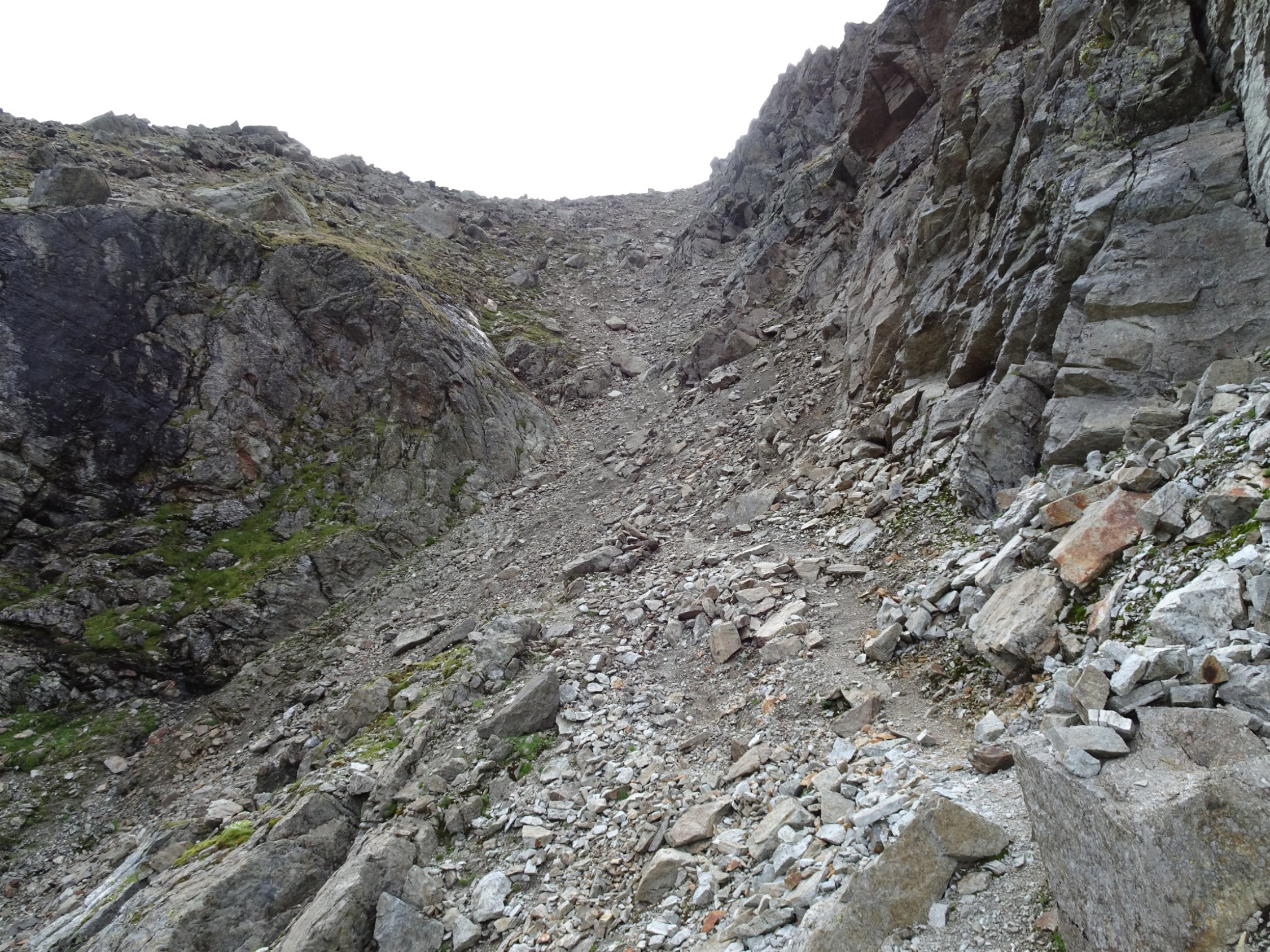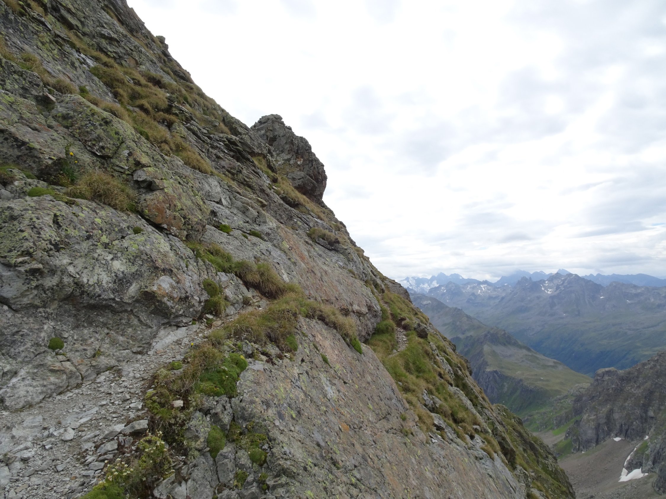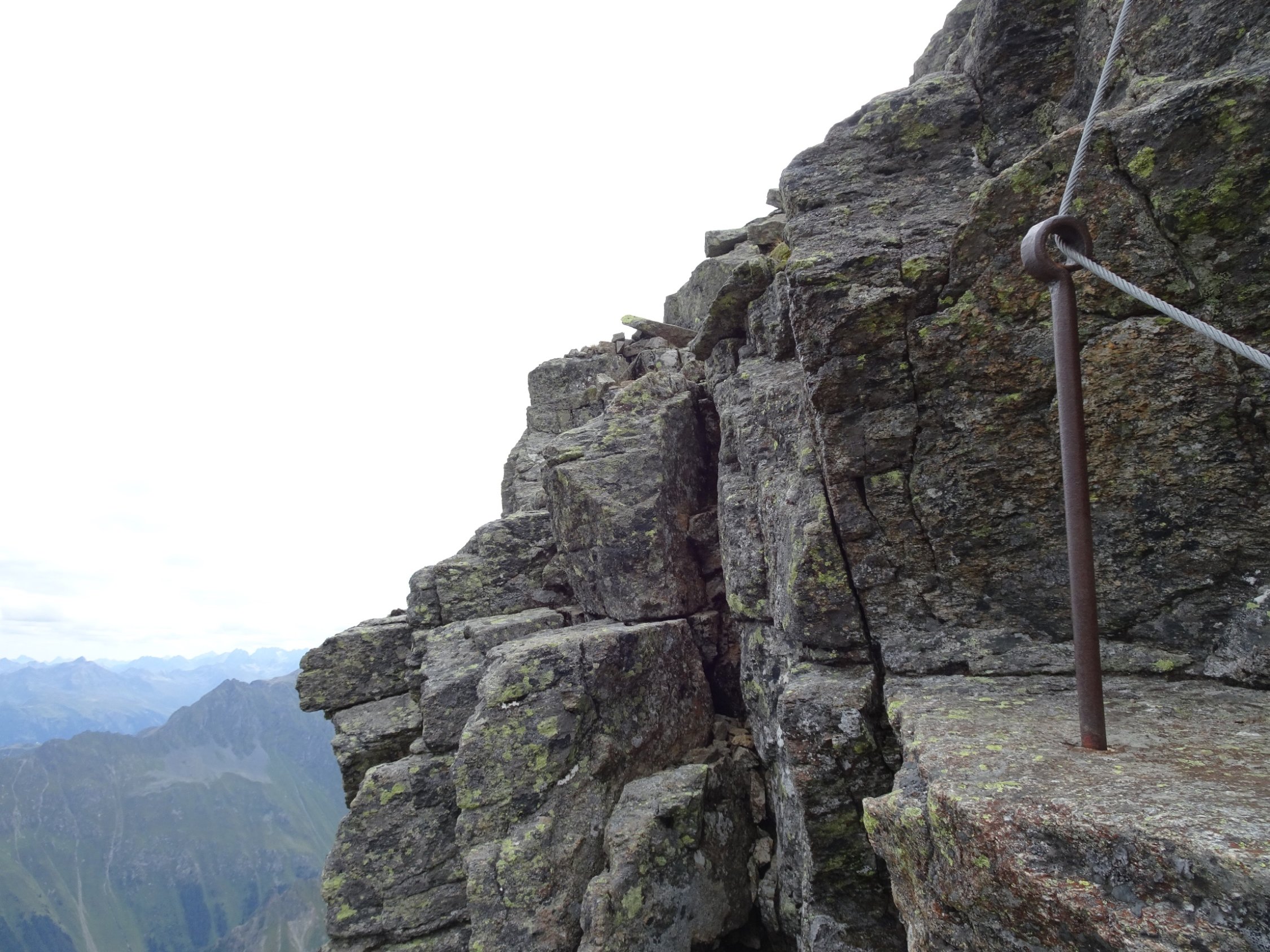 Am oberen Ende des Aufstiegs im Schotterfeld geht es über ein kleines Joch, nach dem es auf einem schmalen Steig eine ziemlich abschüssige Felsplatte zu queren gilt. Die im Fels vorhandenen Verankerungen lassen darauf schließen, dass hier vielleicht mal ein Stahlseil montiert war. Auch die roten Markierungen lassen vermuten dass die Madrisa mal ein offizieller „Wandergipfel“ war?!