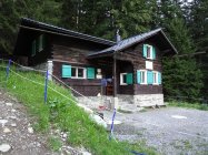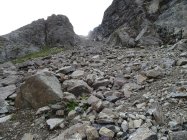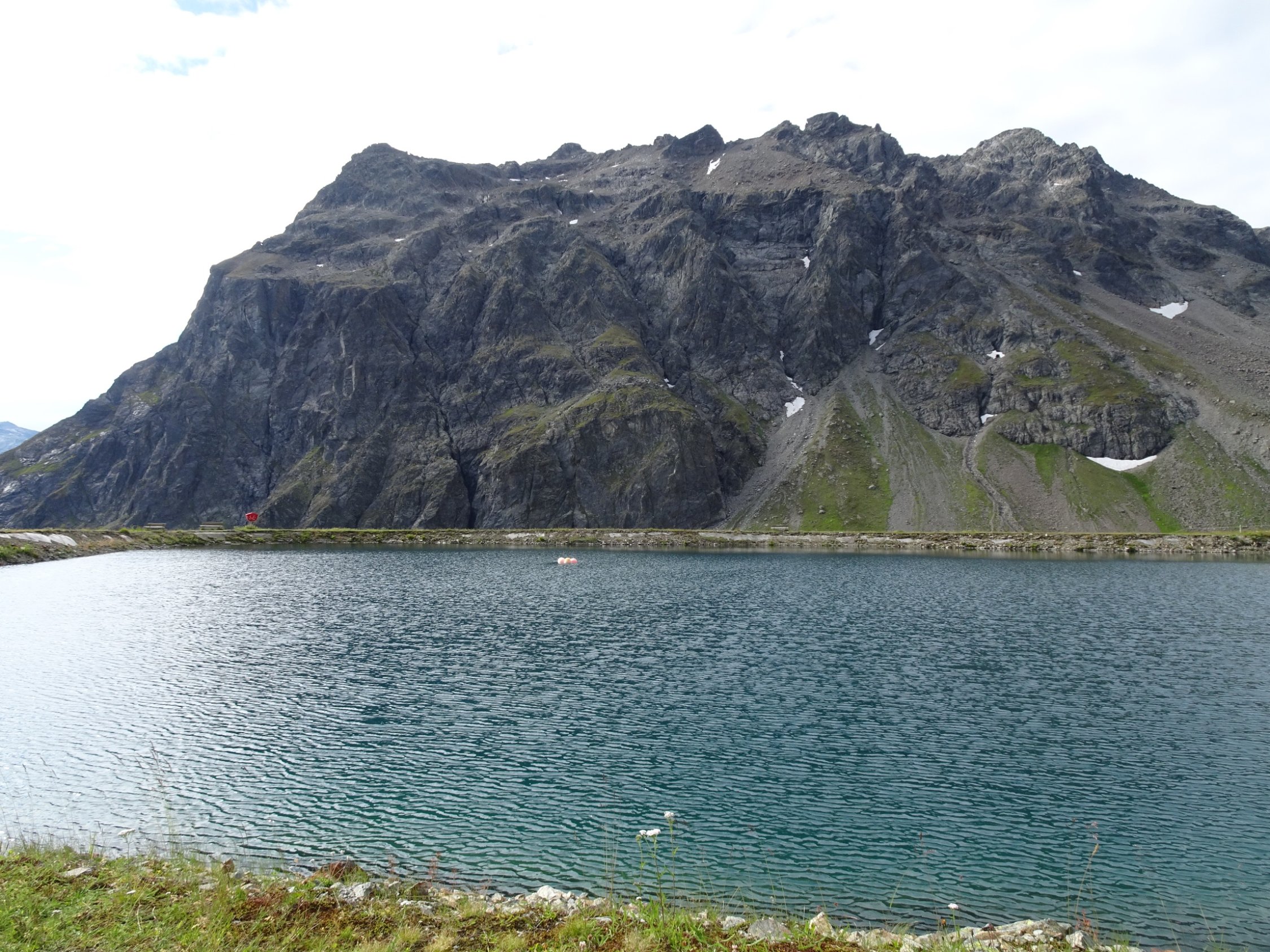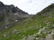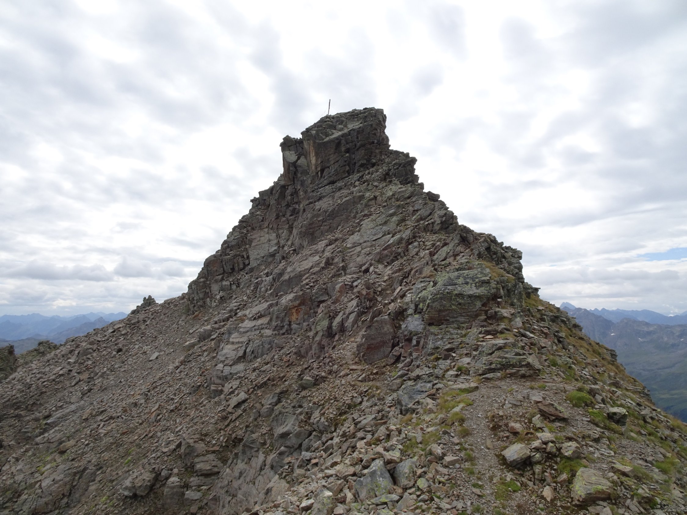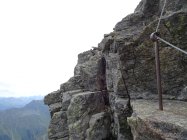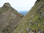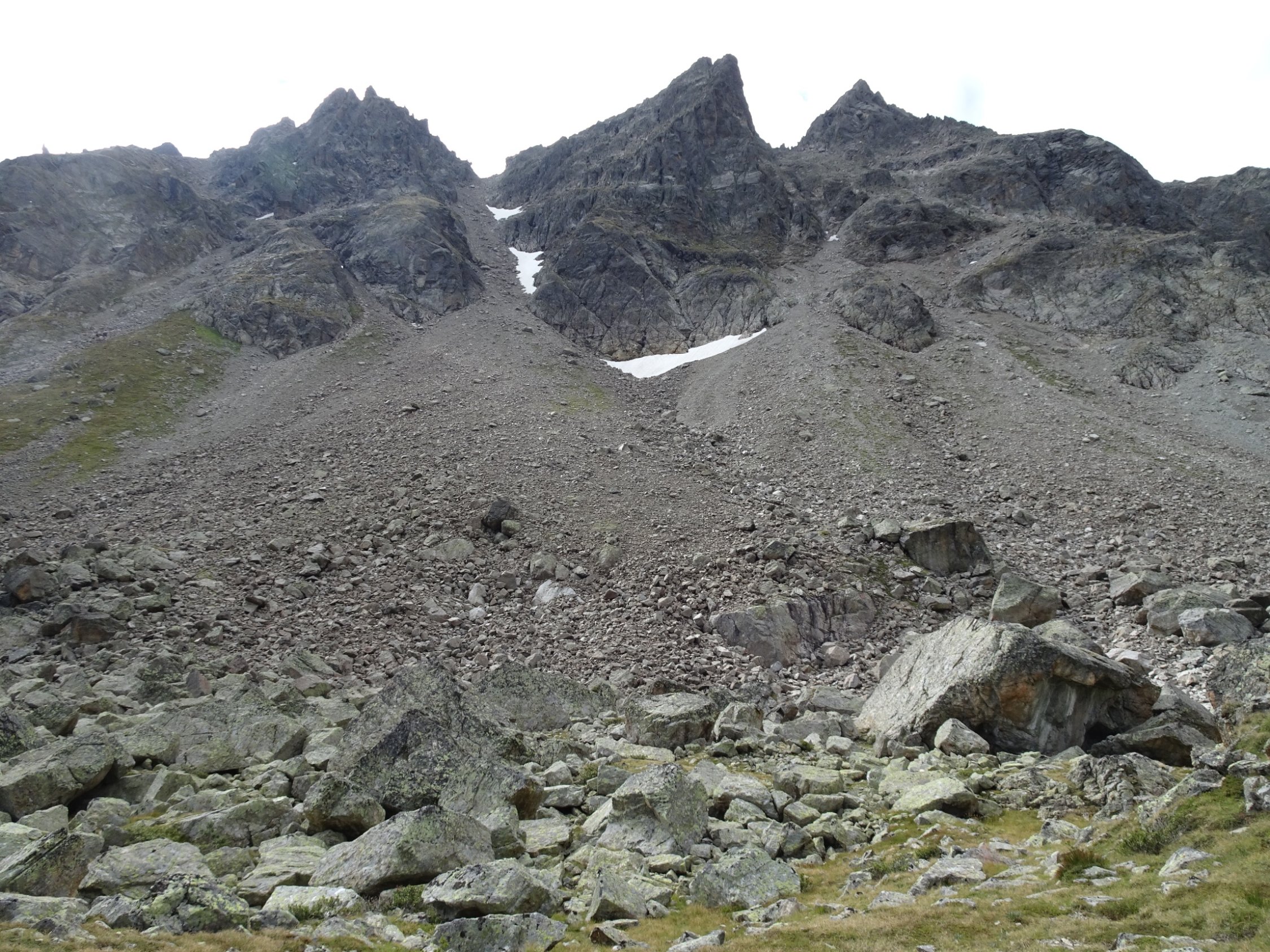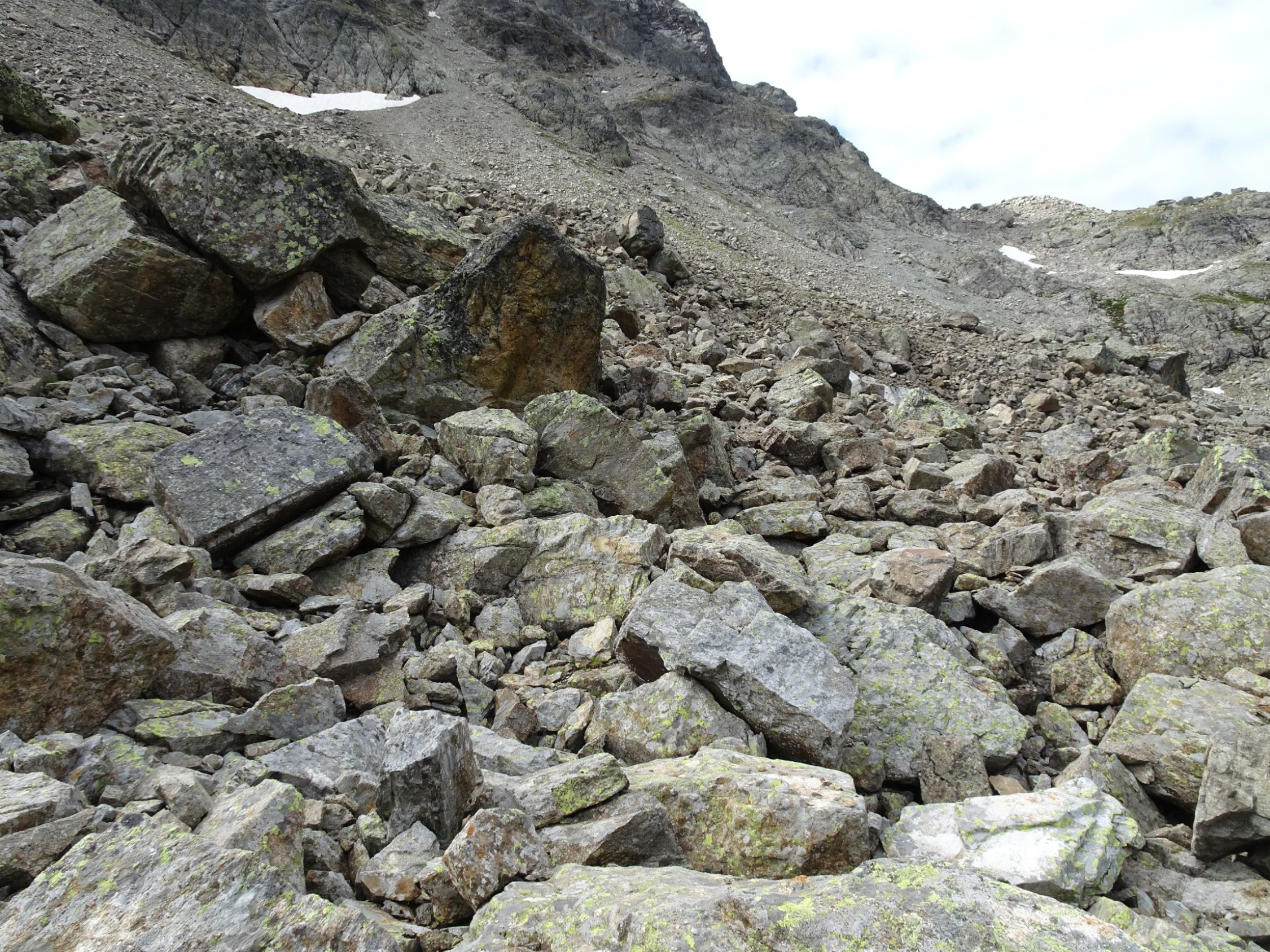 Am oberen Ende des Aufstiegs im Schotterfeld geht es über ein kleines Joch, nach dem es auf einem schmalen Steig eine ziemlich abschüssige Felsplatte zu queren gilt. Die im Fels vorhandenen Verankerungen lassen darauf schließen, dass hier vielleicht mal ein Stahlseil montiert war. Auch die roten Markierungen lassen vermuten dass die Madrisa mal ein offizieller „Wandergipfel“ war?!