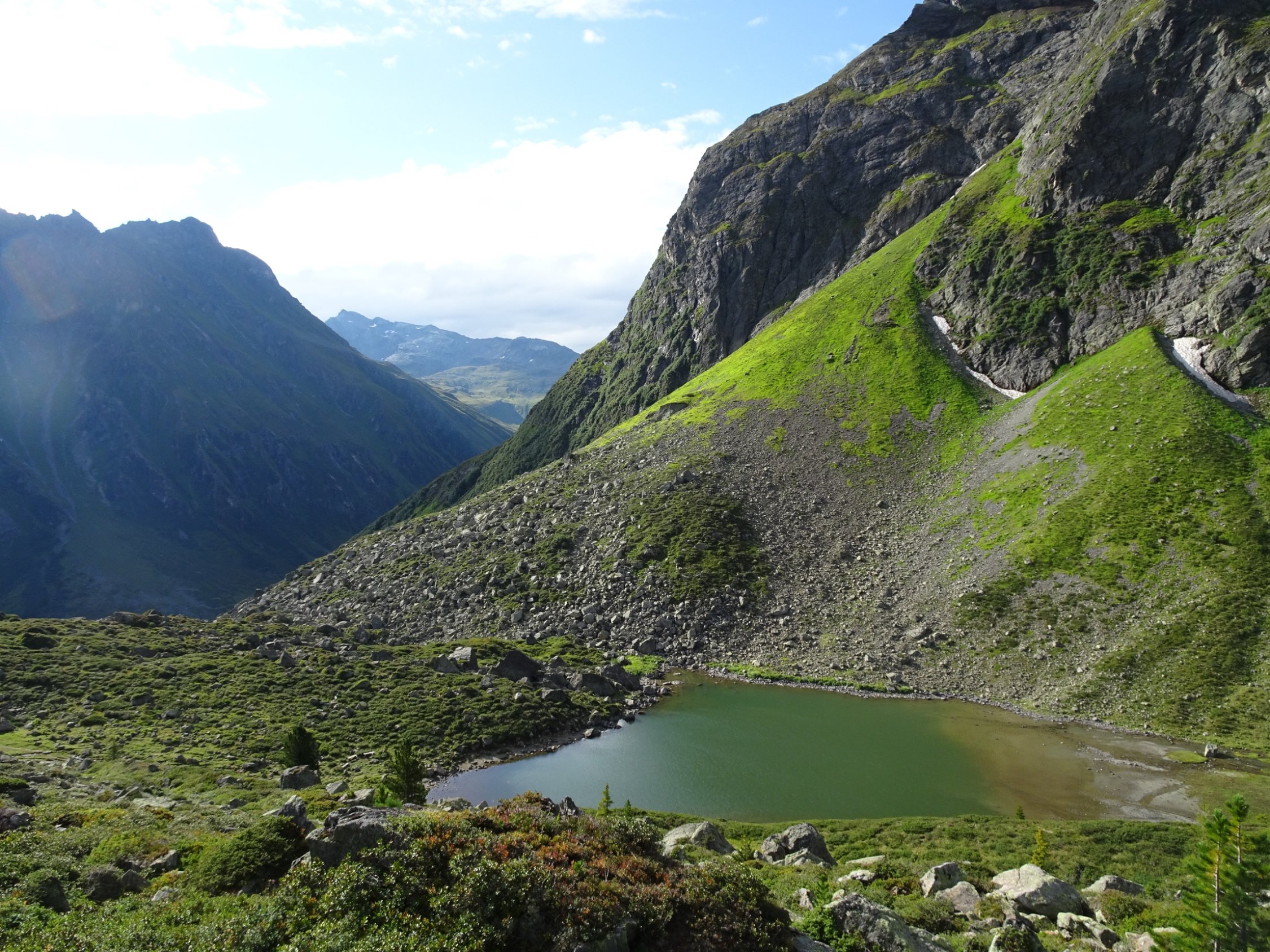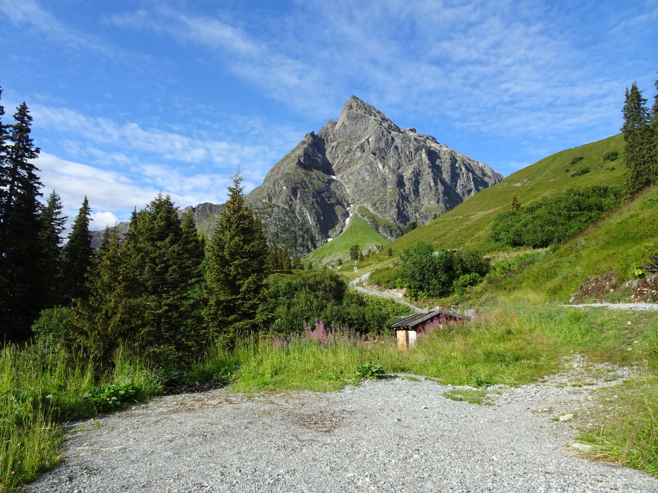 Speziell ist der Blick zu Madrisa- und Rätschenhorn; letzterer mit seinem hellen Gestein gleicht fast einem Gletscher.