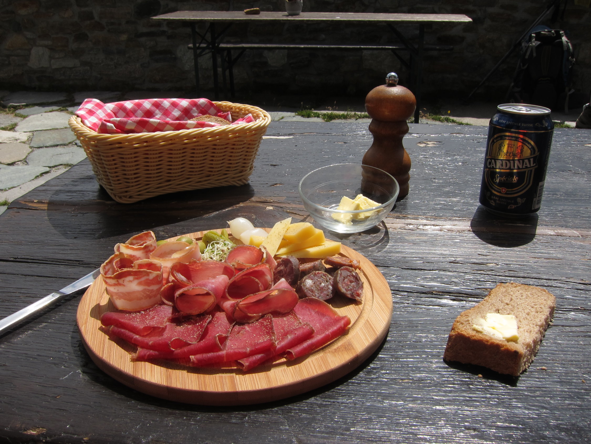 Die "Europaweghütte" auf der Täschalp lädt zur gemütlichen Einkehr - man kann hier auch übernachten. Verkauf von ausgezeichnetem Alpziger, den man z.B. mit Olivenöl, etwas Salz, Oliven, getrockneten Tomaten und Brot geniesst. Ein Gläschen Weisser gehört auch dazu ...