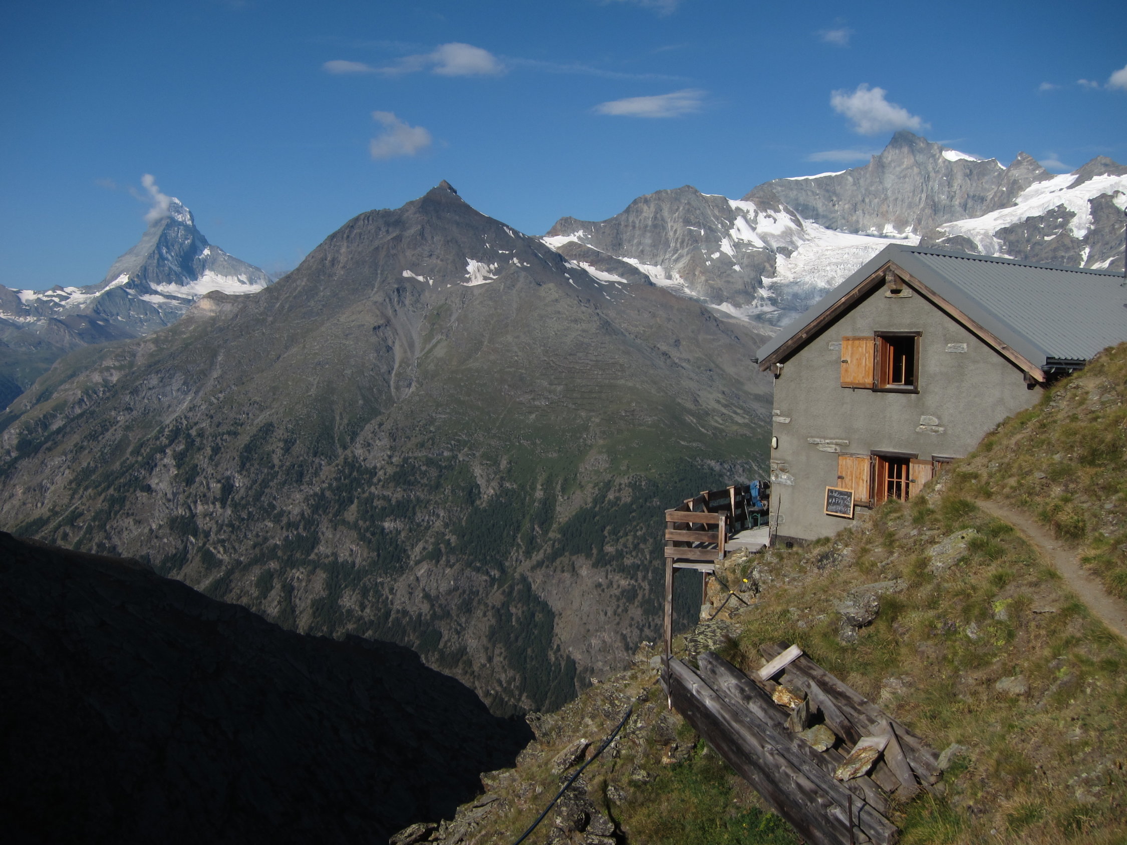 Möchte man die Tour auf drei Tage verlängern, empfiehlt es sich, vor- oder nachher die wunderbar gelegene Kinhütte anzuhängen, die auf dem Europaweg mit der Täschalp verbunden ist. Adlerhorstartig gelegene kleine Hütte, wo man den grossen Touristenscharen meist ausweichen kann. Gut eingerichtete Bergunterkunft im traditionellen Stil. Grossartige Aussicht auf Matter- und Weisshorn.
