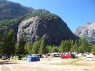 Von den Parkplätzen entlang der Strasse durch den Zeltplatz hindurch zur Brücke über den Sélé, dann auf Trampelpfad über die grosse Wiese rechtshaltend zu Staudenwald, entlang dem Wandfuss bis direkt vor den Klettergarten, dort auf einem kleinen Absatz Start der beiden von mir beschreibenen Routen (gemeinsame erste SL)