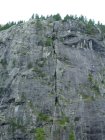 9 Seillängen häufig auf Platten: Ein Aufschwung SL1 athletisch, dann Ein-,bzw. Aufstieg SL2 an Lärche, dann lässig-plattig und immer gut abgesichert bis zum Top. Nur zwei anspruchsvolle Stellen: Ende SL5 an (gebohrtem?) Fingerloch und SL6 eigentliche Crux vor Dach und dann athletisch darüber hinweg