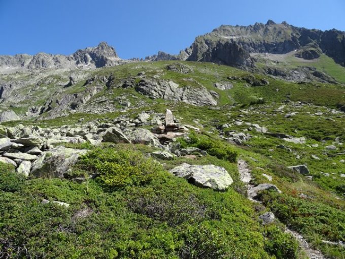 Einstieg in die richtige Route: Ab dem Wannibordsee zweigt ein Wegspürchen ab (siehe Foto). Zudem kennzeichnen kleinere Steinmännchen die richtige Route.