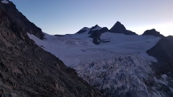 Vom Südgipfel über Blockkletterei, und Firn bis zur Scharte und dann etwas bröselig runter auf den Gletscher und über Aufstiegsroute zurück. Bis zum Gletscher sollte man mind. 1-1.5 Stunden einrechnen.