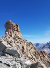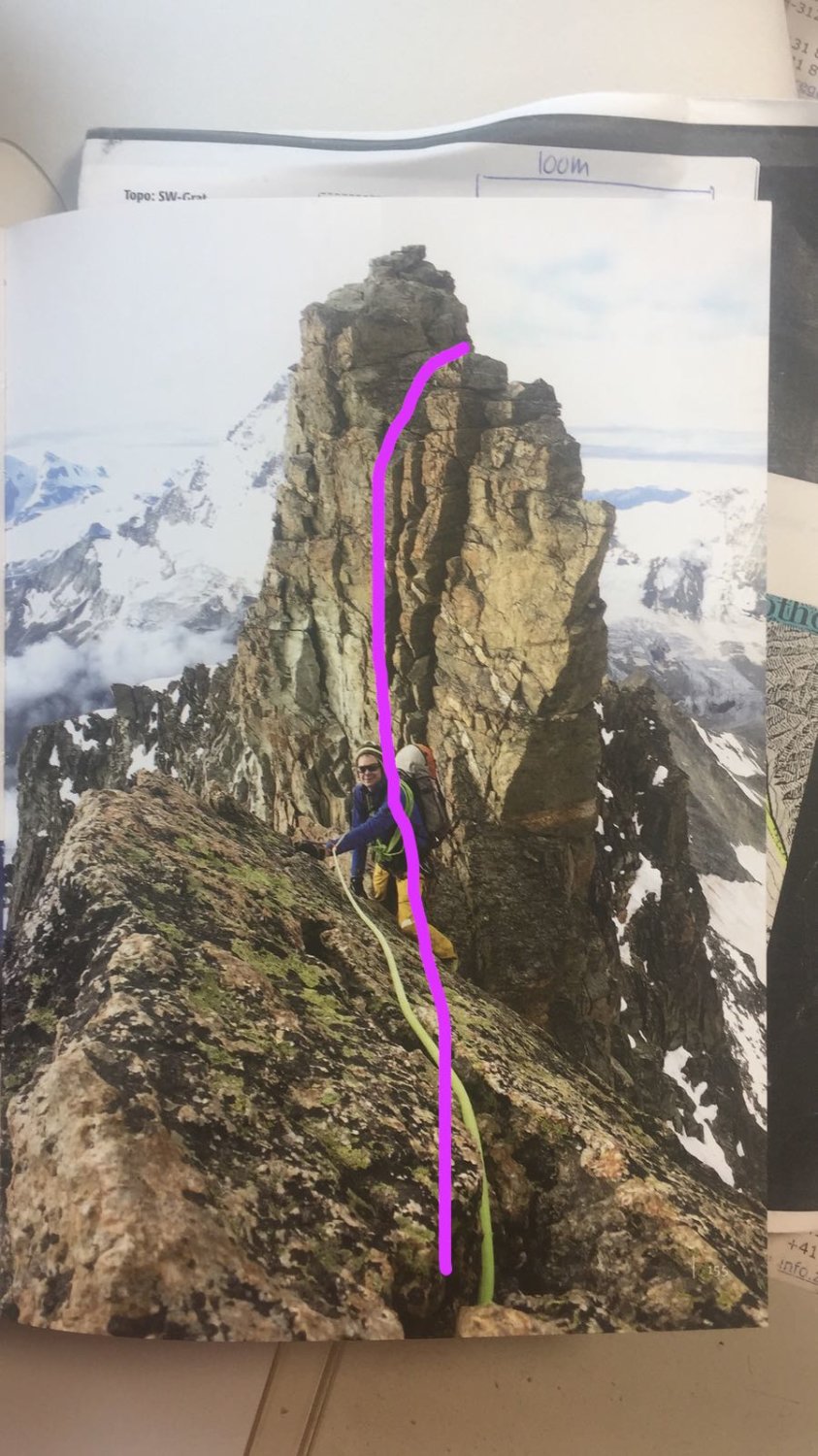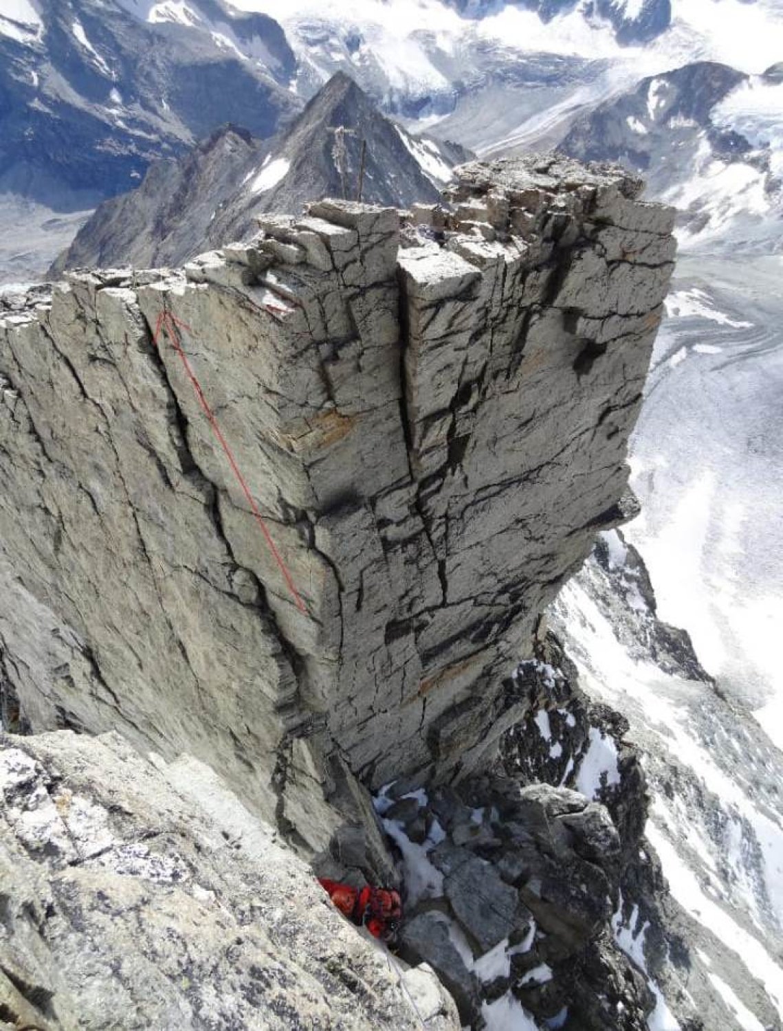 Der Südgipfel ist dann schöne Kletterei die Schuppe ostseitig entlang, III+. Dort lassen sich gut Friends setzen mittlerer Grösse. War aus unserer Sicht nicht 4. Grad. In anderen Berichten war immer davon die Rede. Viele gehen wohl über den Riss nordwestseitig direkt den Südgipfel an, was sicher im 4. Grad anzusiedeln ist. Siehe Foto.