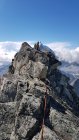 Danach beginnt das Spannende, was einen auf dem ganzen Grat begleitet. Mehr oder weniger lustige aber luftige Abkletterpassage im II-III. Grat. Bis zum ersten Turm geht es dann wieder gut am kurzen Seil.
