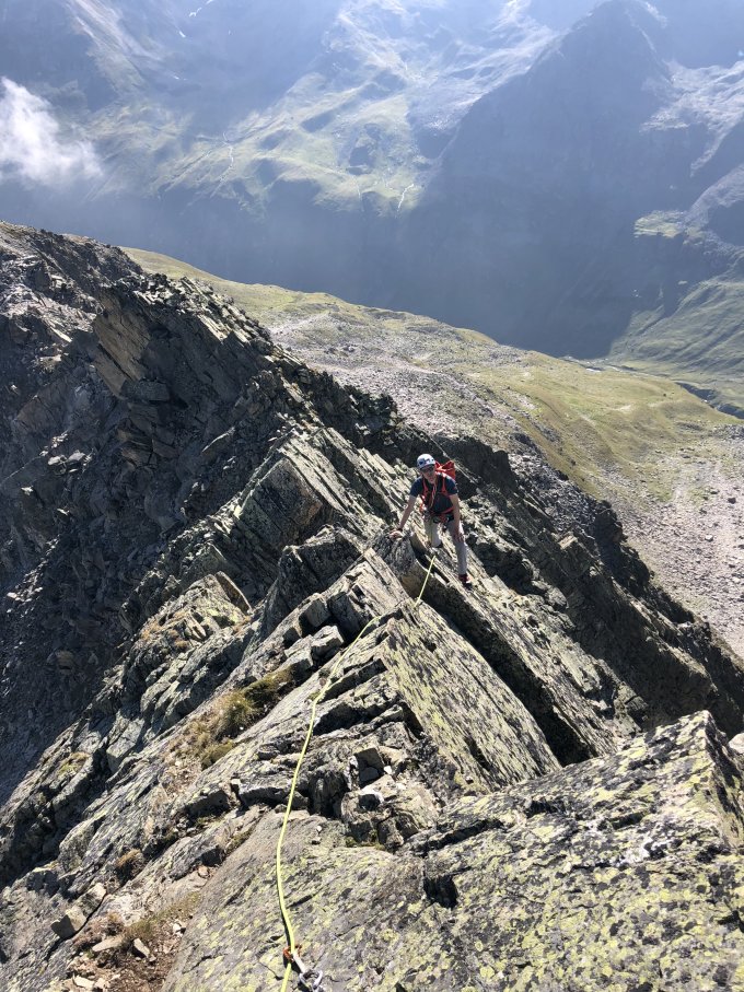 Tour kurz vor dem Gipfel abgebrochen. Leider hatten wir den Gipfelbucheintrag nicht gesehen, wo über den grossen Felsausbruch geschrieben wurde. Min 35m hoher und 5 m breiter Teil des dritten Turmes sind weg. Inkl Bohrhaken und der Route. Sind dann zurückgeklettert. Zwei junge Wilde haben es aber auf abenteuerliche Weise trotzdem mit einer Umleitung versucht indem sie an einem Zacken abgeseilt sind und woanders hoch. Im Moment nicht empfehlenswert bzw nicht machbar. Es poltert ausserdem weiterhin sehr in der Region.