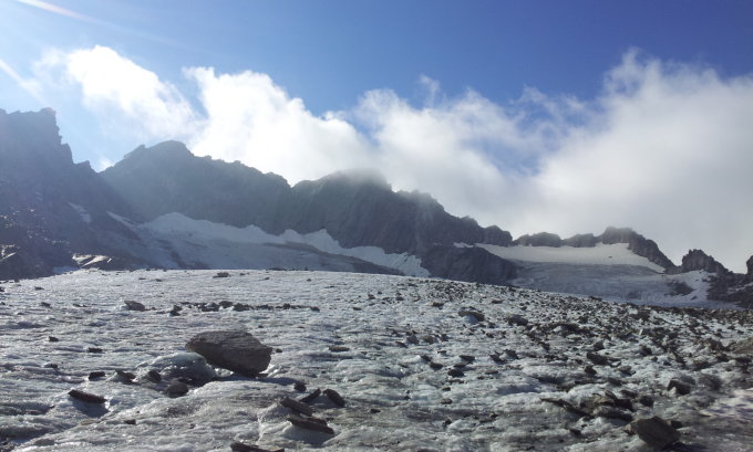 Gletscher aper, letzte 50 Hm guter Trittschnee bis zur Ravetschlücke. Die letzten 15Hm der Lücke sind im Schutt hoch zu steigen.