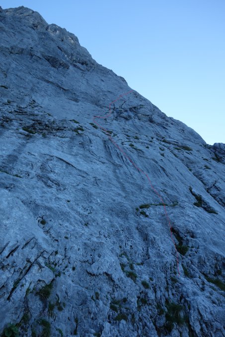 Man kann die direkte Variante machen (drei Seillängen der Delikatessen; die erste Seillänge der Delikatessen ist sehr rauh und scharfkantig - die anderen zwei haben wir nicht gemacht). Die Orientierung in der Hazo Fantastica ist nach der zweiten Sl. etwas schwierig, da die Routen recht eng verlaufen.