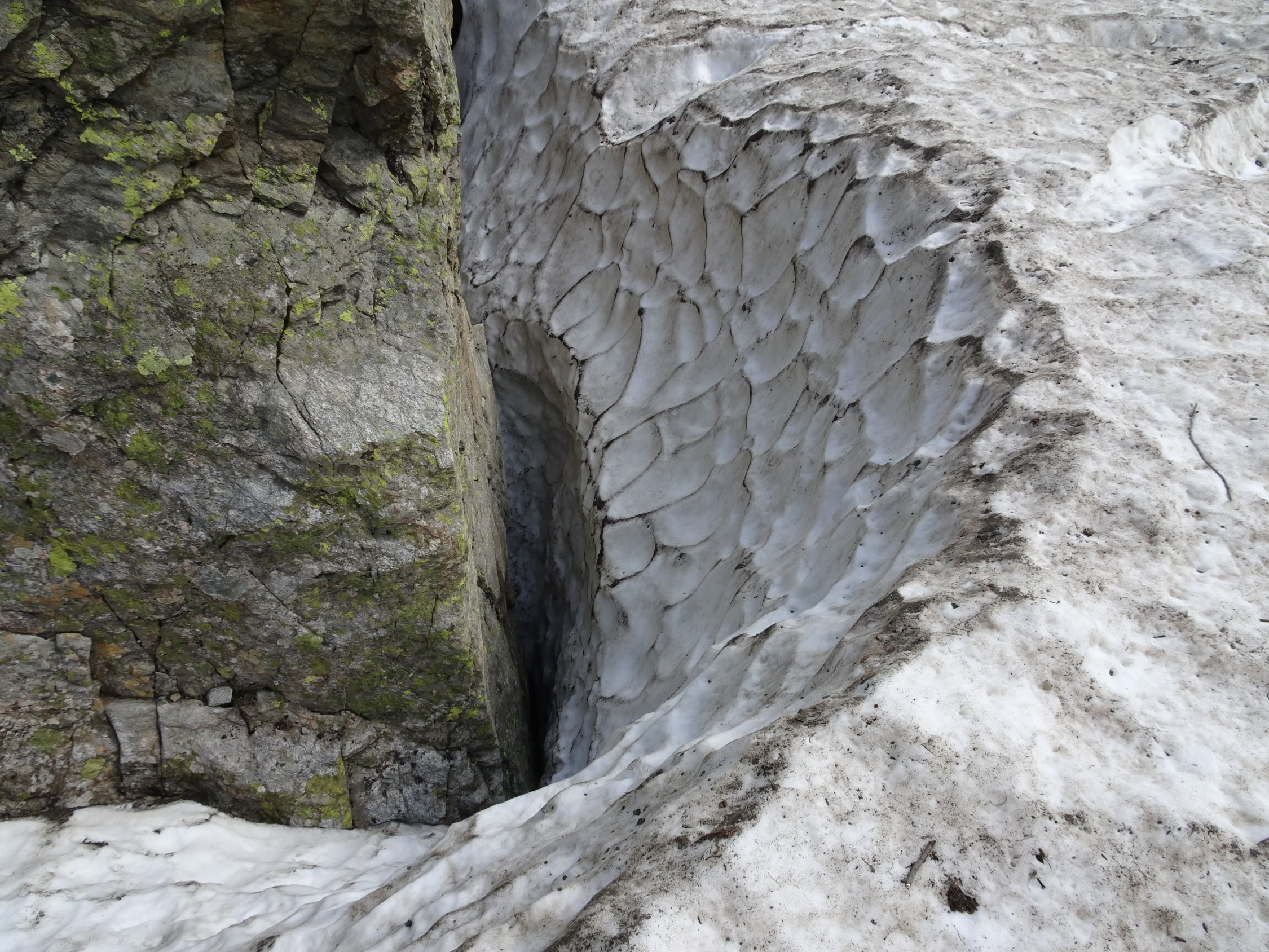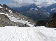 Firn und Gletscher sind schön weich, so dass morgens (nach 9 Uhr) Steigeisen nicht mehr zwingend notwendig sind. Teils rutscht man zwar etwas, aber generell braucht es die Steigeisen nicht unbedingt, wenn man sicher hochsteigt. Beim Fels unten wird eine Passage langsam etwas aper.