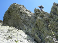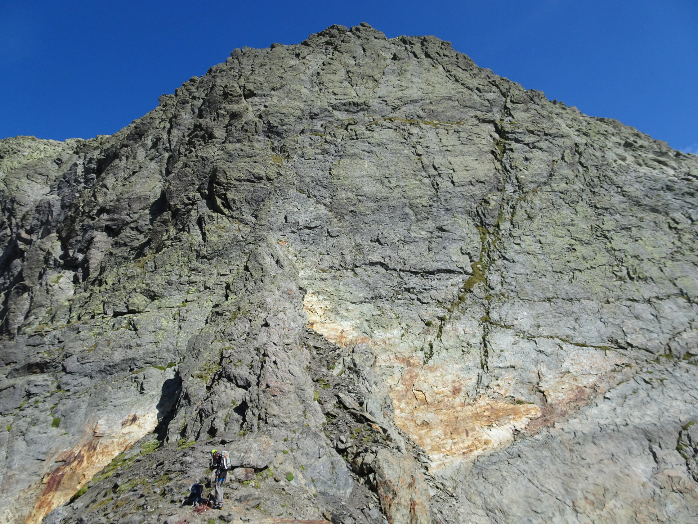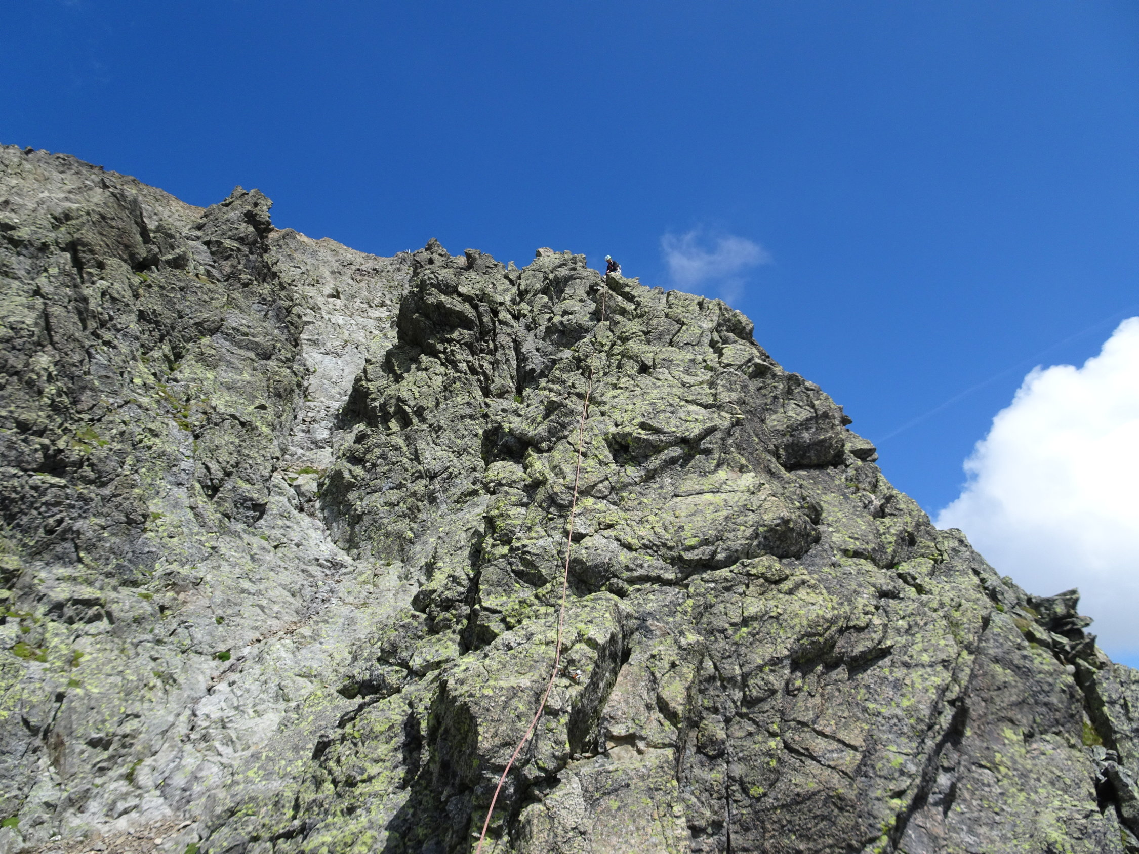 Einfache Kletterei als schöne Übung mit den schweren Schuhen zu begehen. Auf dem Grassen und dem anstehenden Grat sind die geologischen Schichten mit ihren Farben fantastisch. Der Fels selber variiert zwischen Granit und Gneiss.