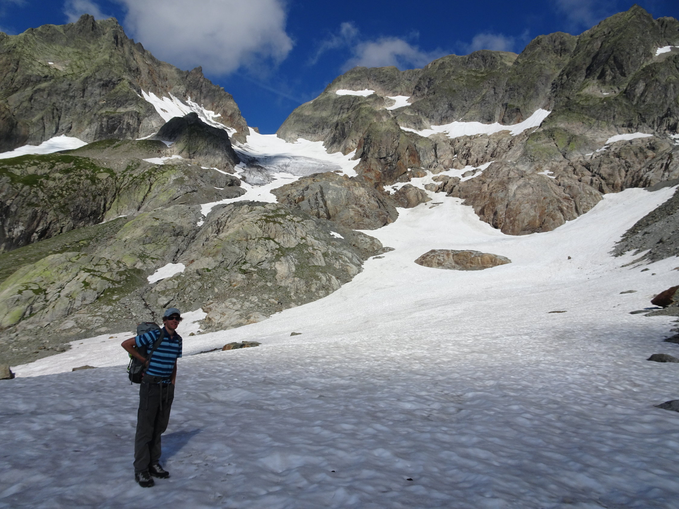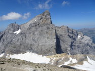 Abstieg über Grat teils trocken im Schutt und teils über weichen Firn. Der Abstieg vom Stössensattel ist etwas steil, aber geht auch ohne Steigeisen. Pickel aber nützlich.